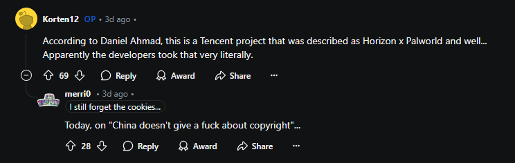 當中有玩家表示,倘若機械獸的機甲設計上再稍作改變,例如將友好燈光改為綠色,敵對燈光改為紫色之類的,或許勉強還算勉強過關,但《Light of Motiram》目前所釋出的角色外觀已經無法辯解,因此認為《地平線》開發商Guerrilla Games應該考慮採取法律行動。