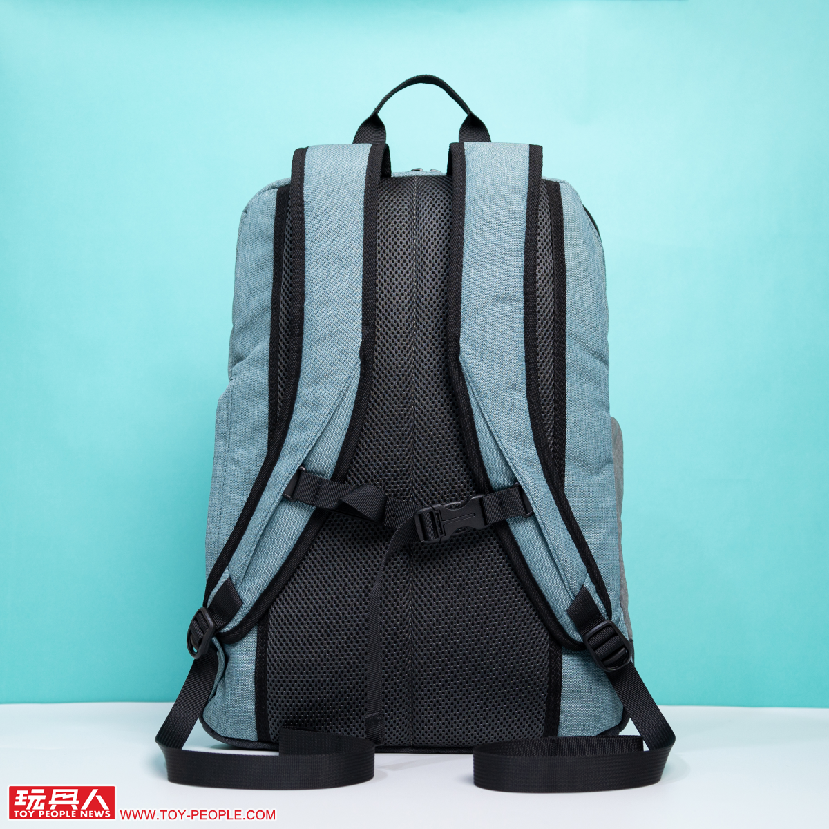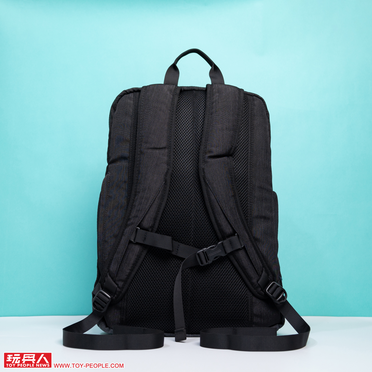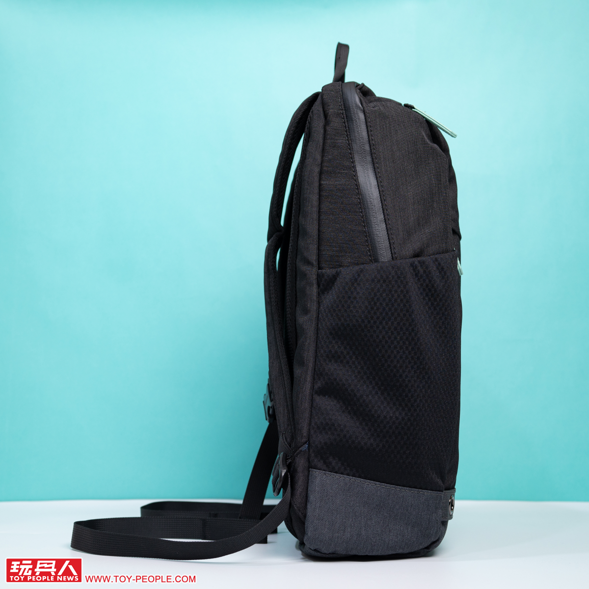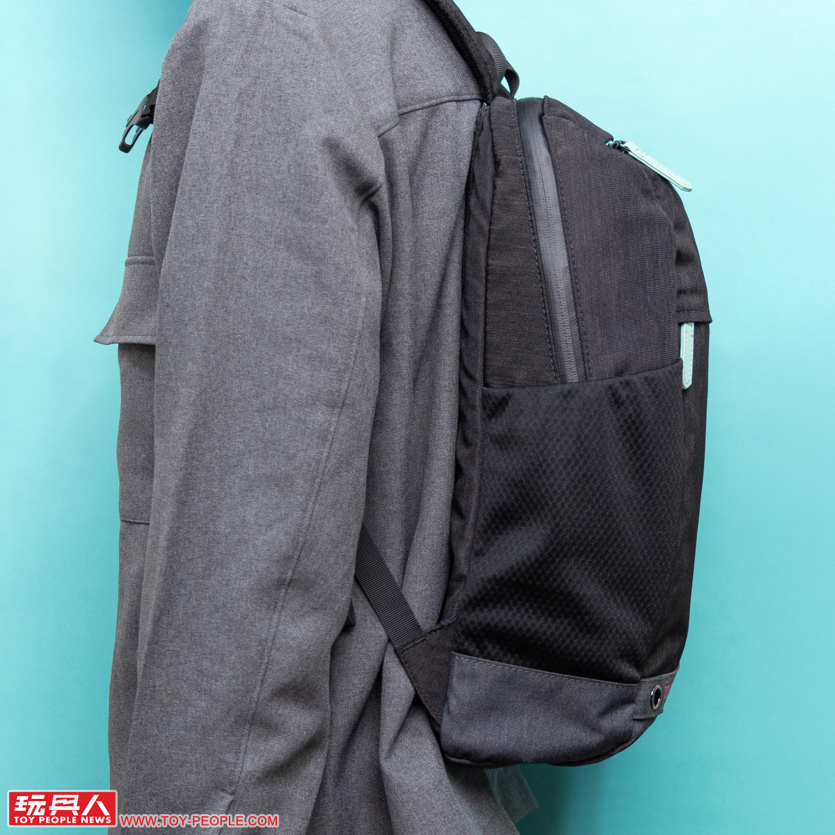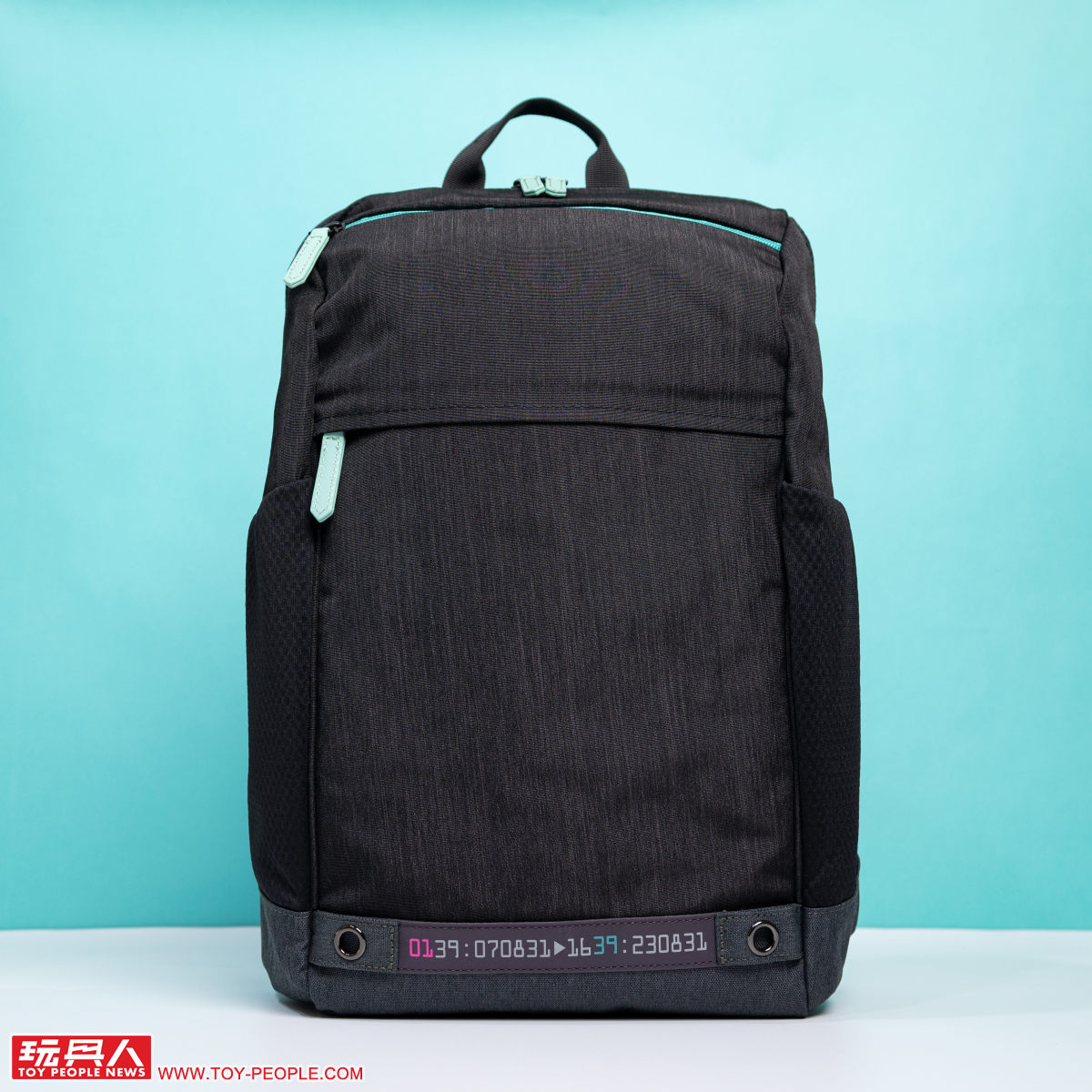 接著我們看到第二款的潮流黑電腦後背包,以典雅黑色為主調可說是讓初音藍綠色的拉鏈拉手、拉鏈條更加顯眼,底部的防汙處理同樣採用灰黑色,搭配兩側黑色的網狀口袋,散發出俐落的酷勁!