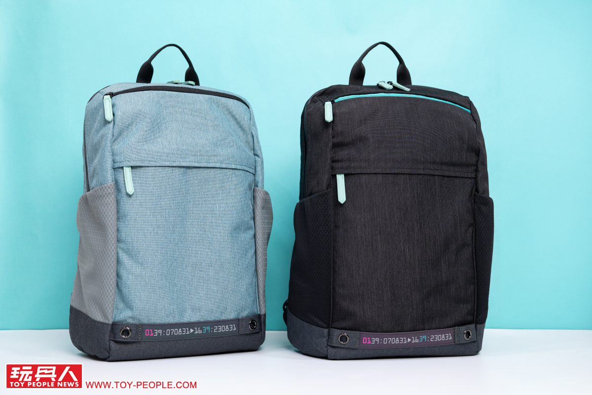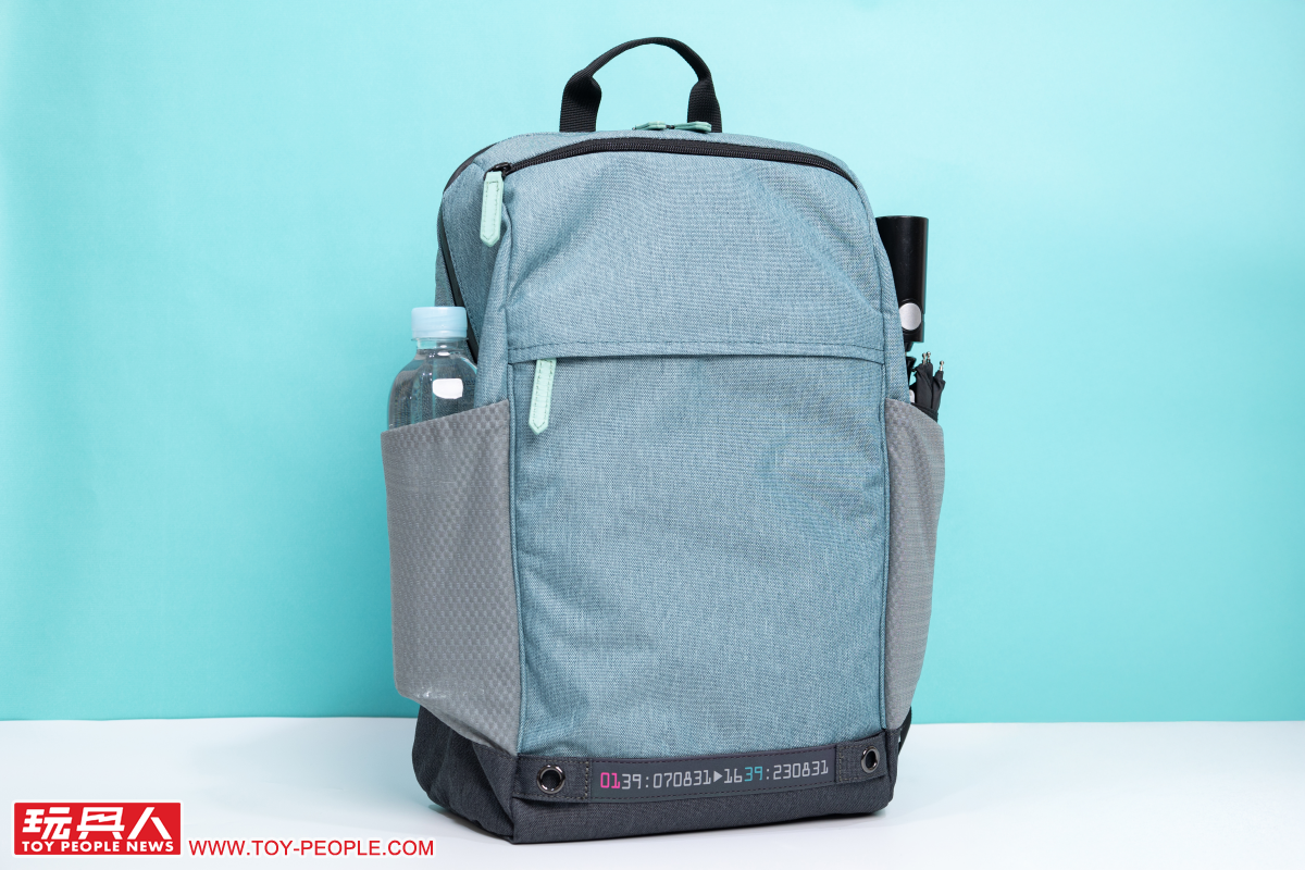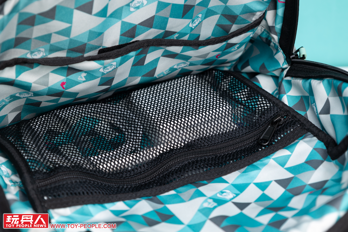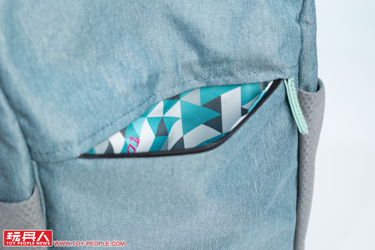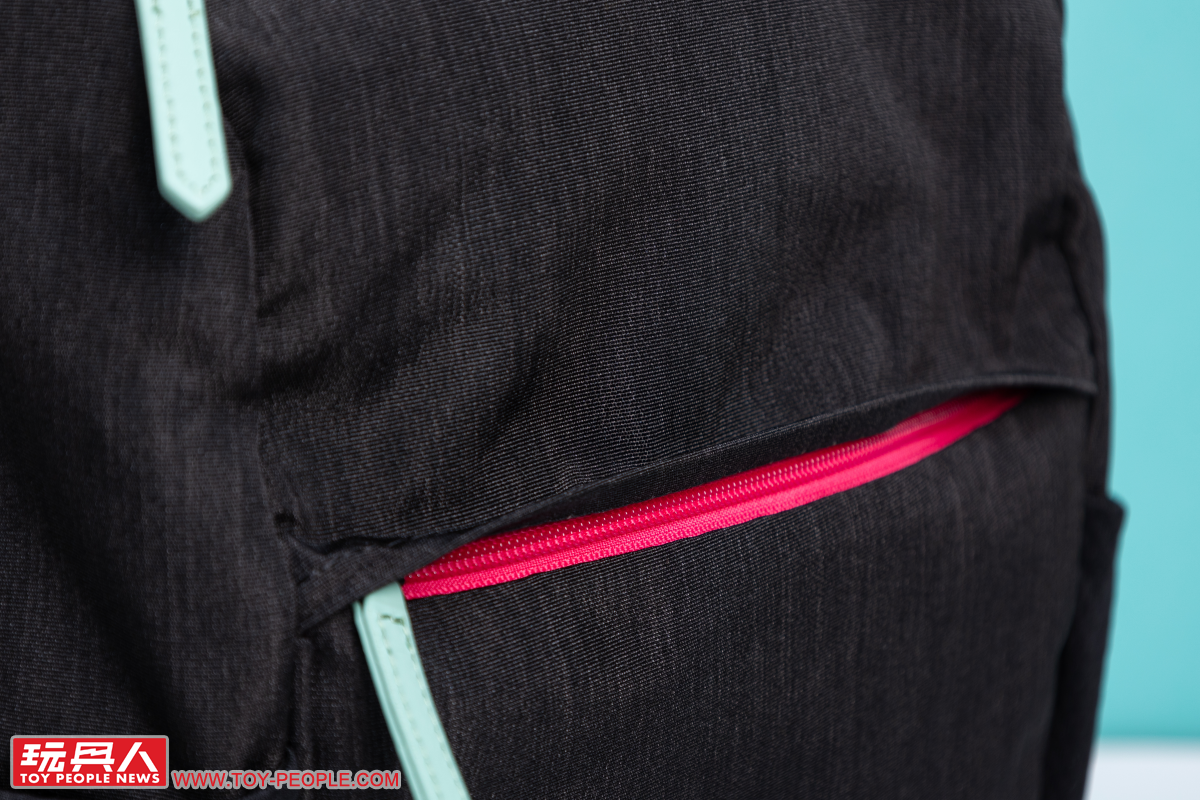 Miku綠款式的後背包採用令人直觀聯想到初音的藍綠色,兩側灰色的網狀口袋則作為底部灰黑防汙部分在視覺上的完美銜接,搭配黑色拉鏈條,使整體呈現出活潑、卻也不會太過休閒的實用氛圍。