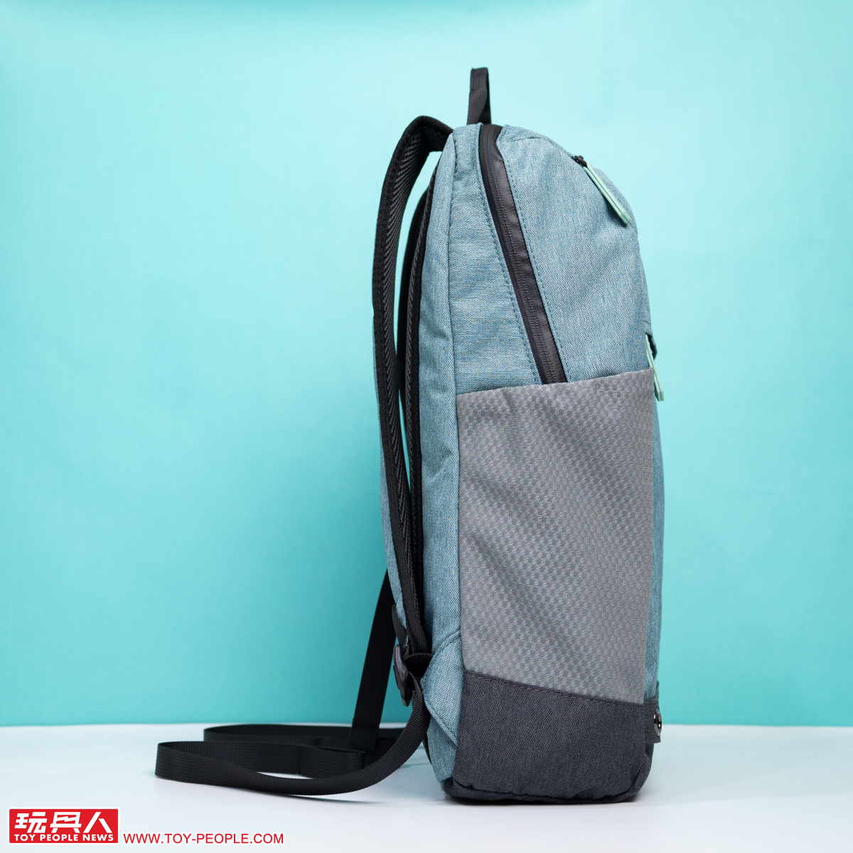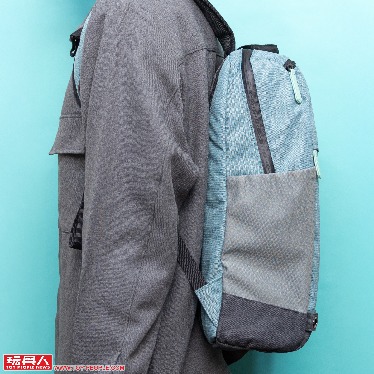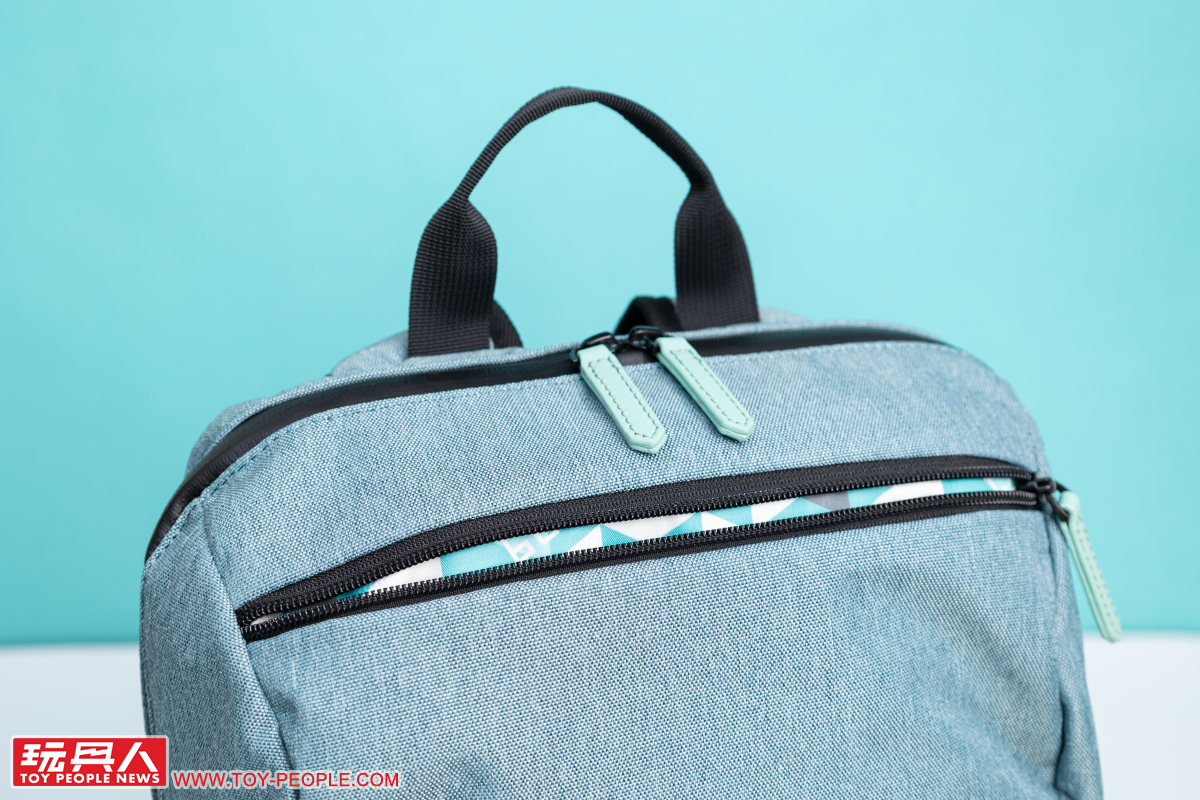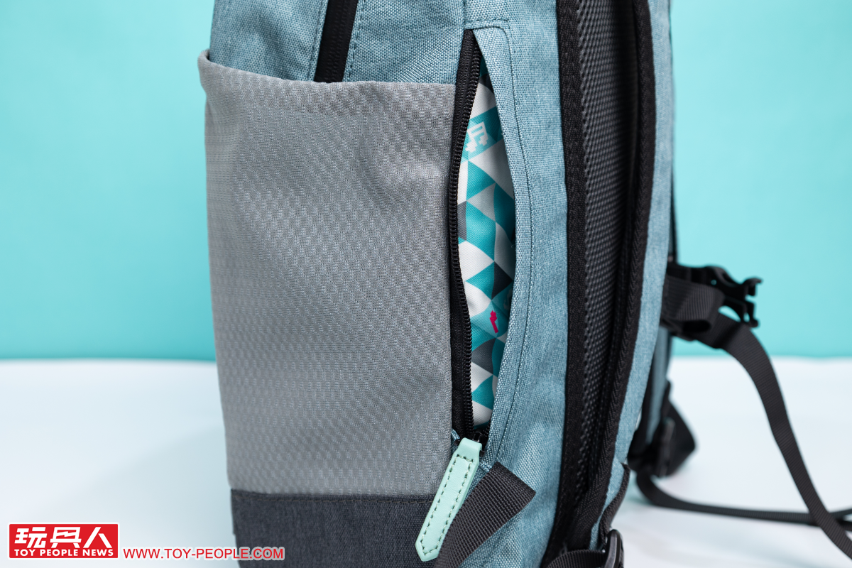 Miku綠款式的後背包採用令人直觀聯想到初音的藍綠色,兩側灰色的網狀口袋則作為底部灰黑防汙部分在視覺上的完美銜接,搭配黑色拉鏈條,使整體呈現出活潑、卻也不會太過休閒的實用氛圍。