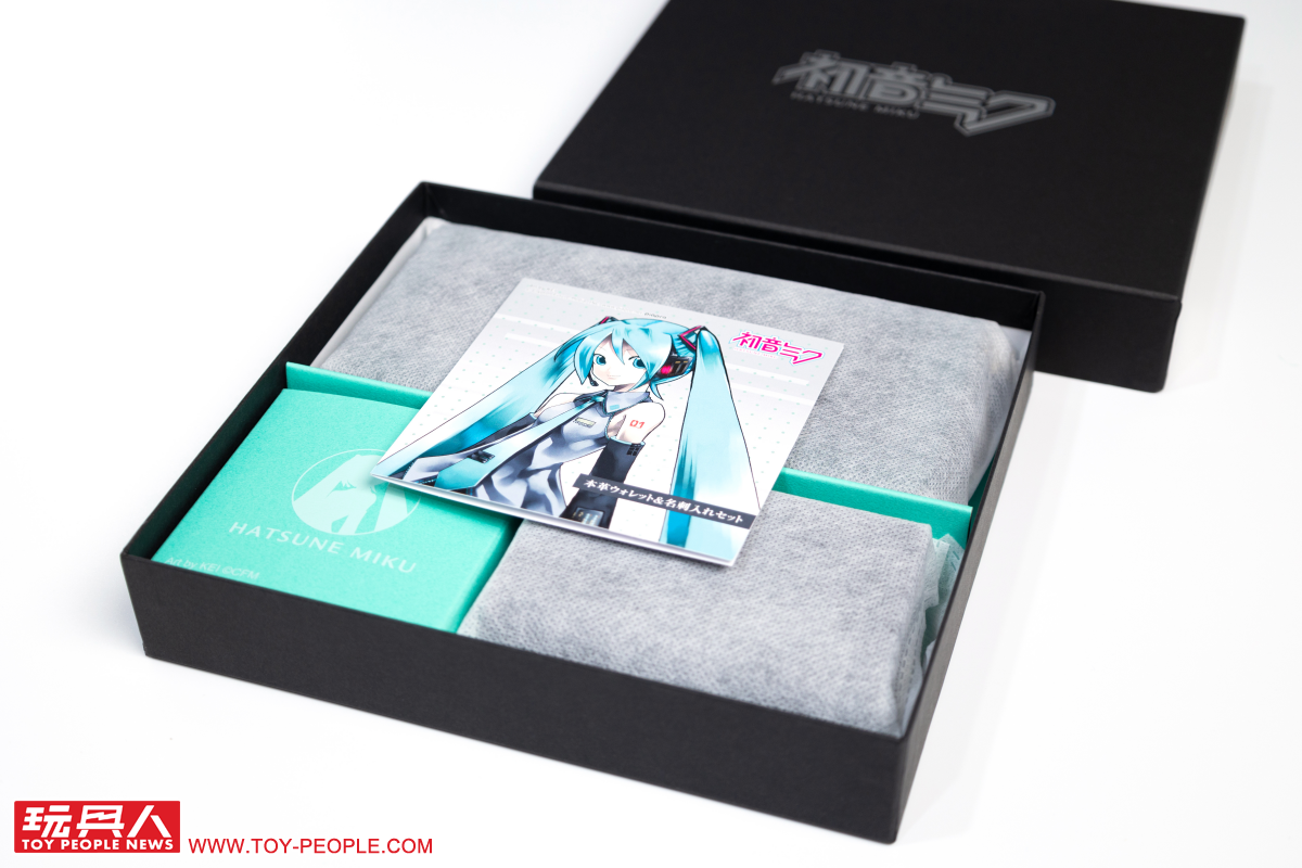 ▼ 一打開可以看到以布袋好好包裝的皮夾、名片夾,裡頭還有一張初音插圖的產品保證卡。