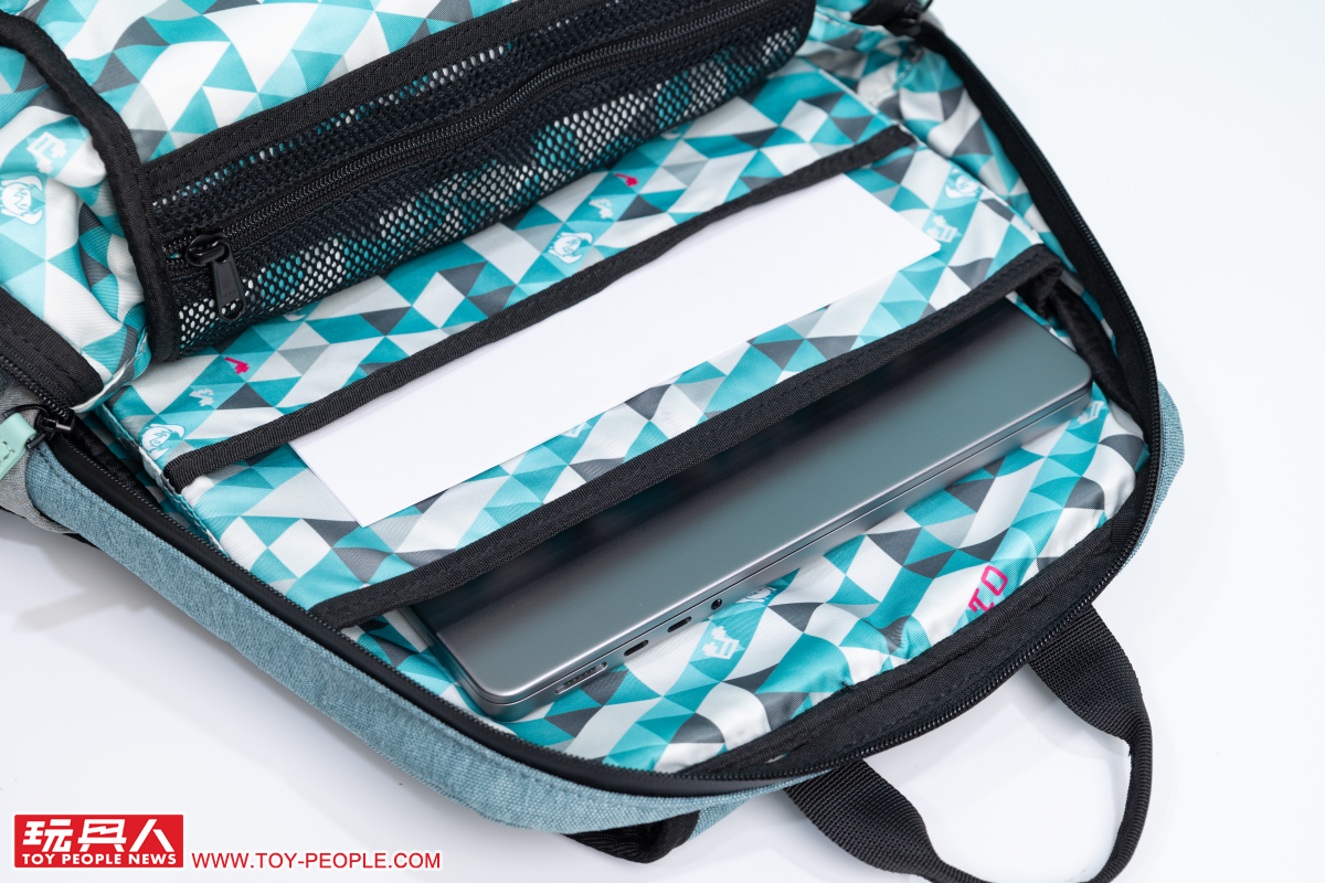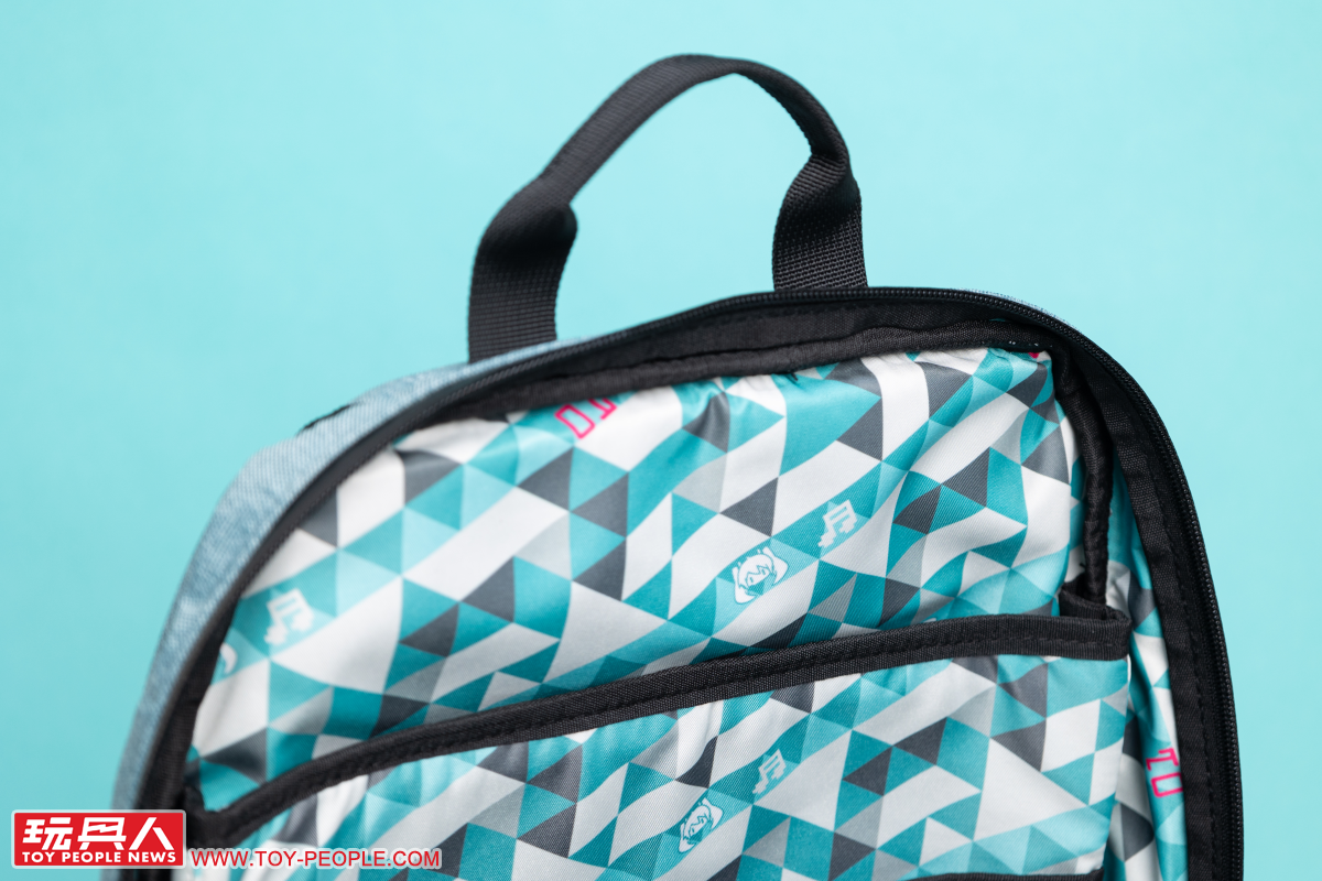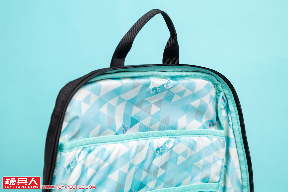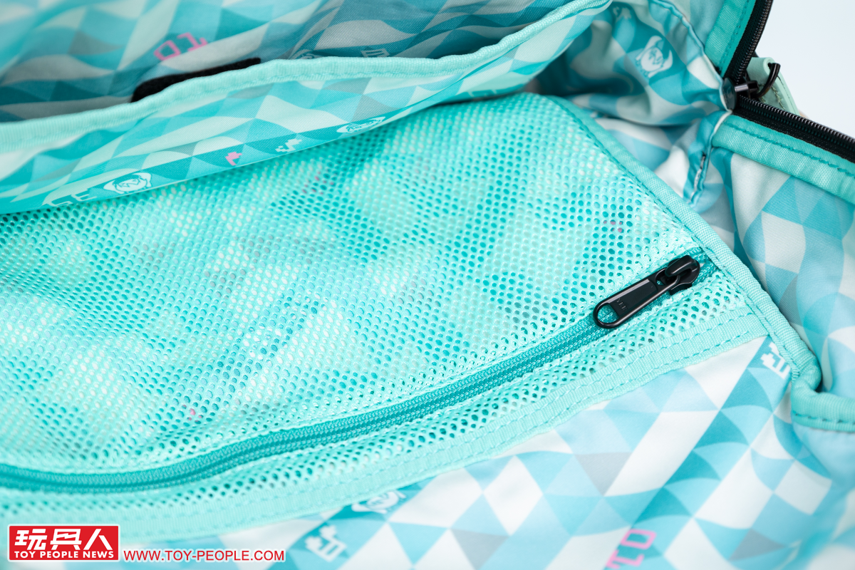 再來我們把包包打開來看看吧~首先映入眼簾就是滿滿的初音風內襯!以初音的藍綠色、灰色幾何圖案為基底,並注入「01」、Q 版的初音臉部圖案、音符等元素,打造出俏皮又可愛的風格。
