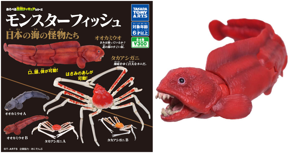 T-ARTS致力於真實打造、介紹生物與生態的「遊玩生物系列轉蛋(あそべる生物フィギュアシリーズ)」,本次以如怪獸一般的海底生物為主角,推出「怪獸魚 日本的海底怪物們」可動轉蛋,收錄有頭身尾可動的「東方狼魚」,全長約 12.5 公分,還原顎上突出的牙齒特徵!共有灰、紅兩種配色。另外則是世界上最大的節肢動物「甘氏巨螯蟹」,尺寸達 14.5 公分,細長的如剪刀般的抓子和腿部也有可動設計~