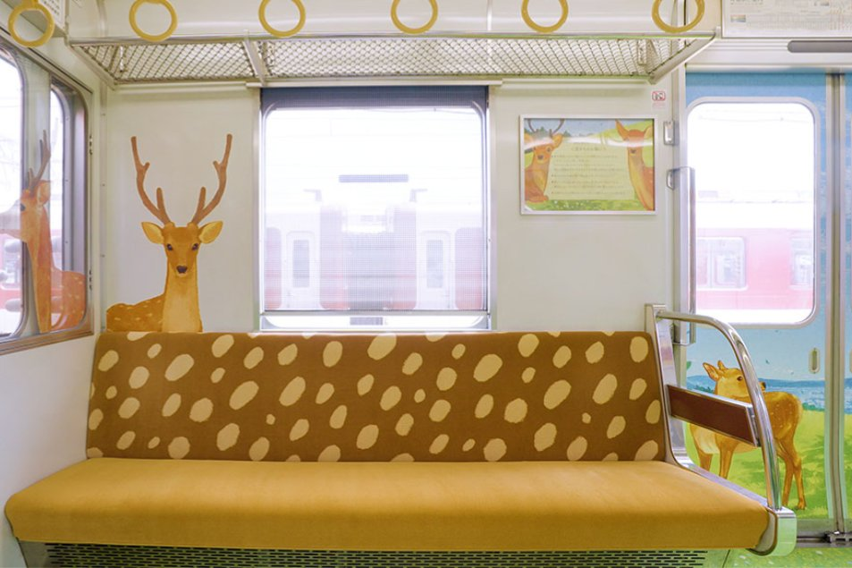 在奈良的電車,不只電車本體,連廣告欄、電車扶手吊環、座椅等各處,都是當地最著名的「鹿」的花樣,充滿了地方風情,真的非常有趣。