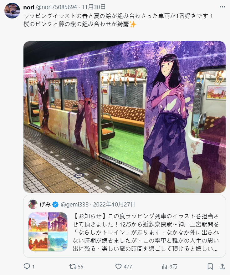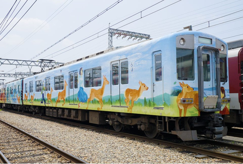 近鐵奈良的車輛,外觀還有繪師繪製的插圖,整個氛圍非常獨特,不少網友非常喜歡這樣的設計。