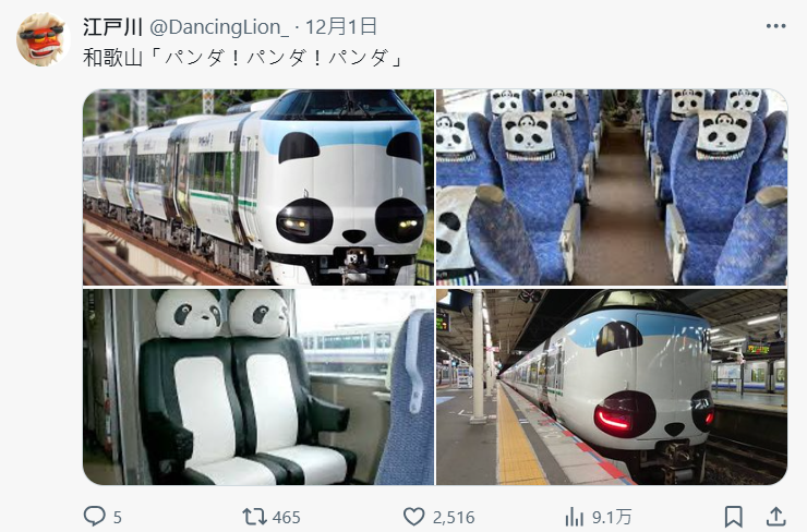 像和歌山就以當地非常有名的貓熊作為主題,打造專屬的「貓熊黑潮號」電車,讓遊客前往當地旅遊景點 Adventure World 冒險大世界,擁有集動物園、水族館、遊樂園於一體的地方,非常值得旅遊前往。