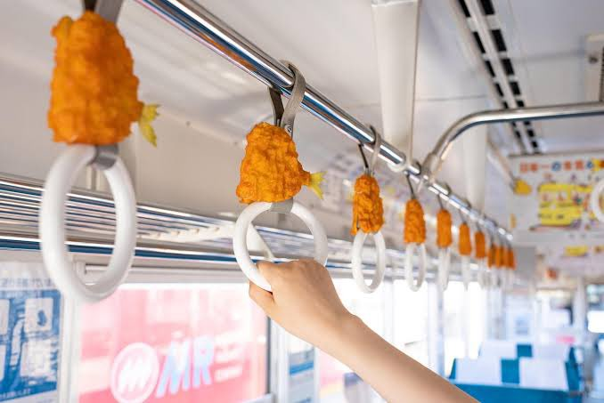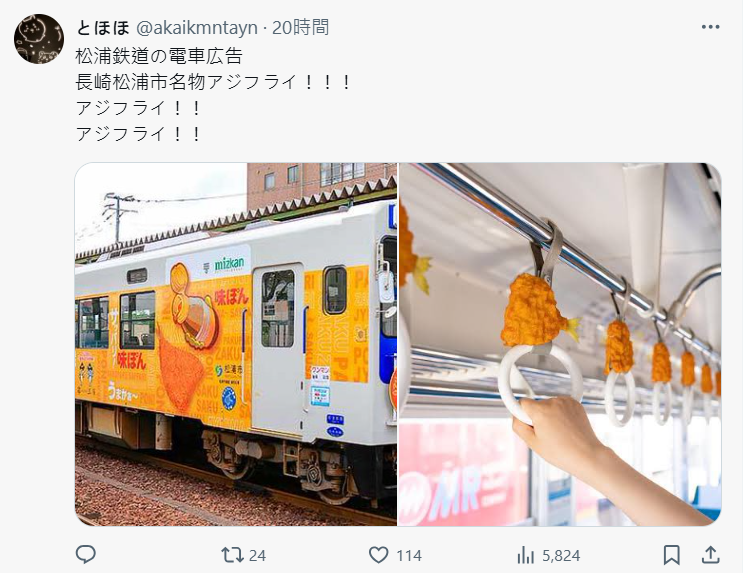 這其實是沿用長崎縣的松浦市名物「炸竹莢魚排」為概念,連電車外都貼滿食物的圖片,車內吊環扶手更是使用魚排造型,相當具有玩味。