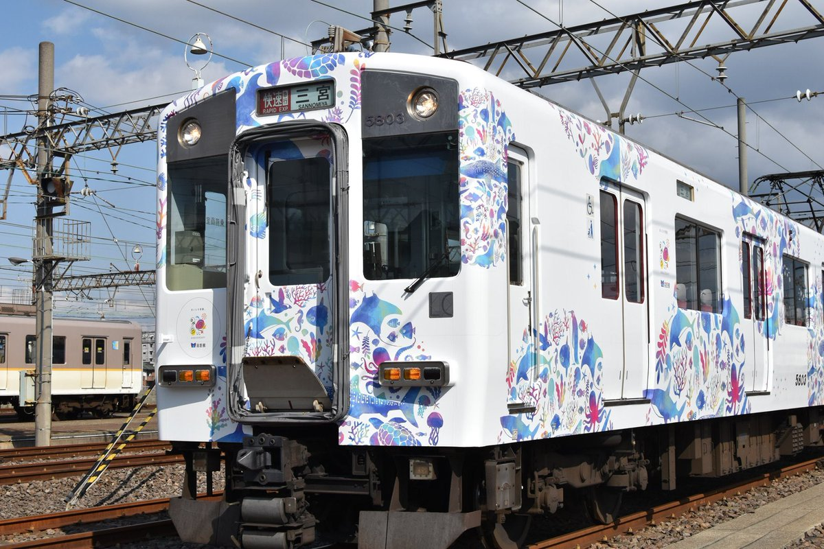 這是前往大阪景點大型水族館設施「海遊館」的專屬電車,電車內外都採用特別繪製的海洋生物插圖來佈置,格外有著不同的美感。