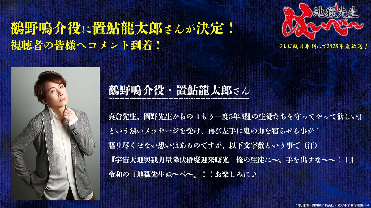 並也確定此次的新動畫主演聲優將與 1996 年的版本相同,主角「神眉」鵺野鳴介同樣由置鮎龍太郎擔任配音。置鮎龍太郎也表示,這次還能回歸配音真的很不可思議,上次已經是快 30 年前自己還年輕的時候。能喊著『宇宙天地賜我力量降伏群魔迎來曙光!!』這句經典台詞,真的感受到滿滿的能量,期待後續播出的表現了。