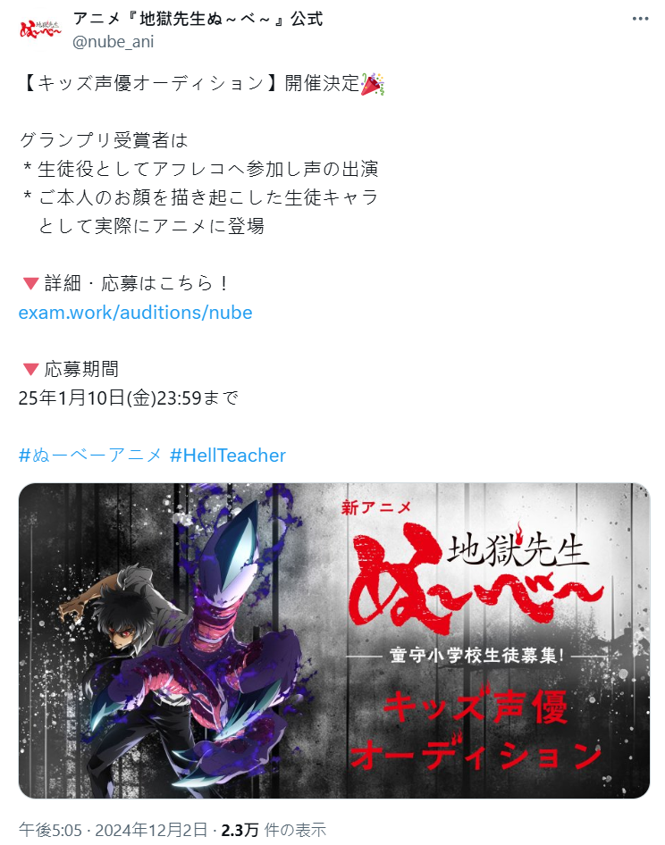 另外,官方也宣布將在日本國內舉辦「孩童聲優甄選」,入選者可以參與配音錄製童守小學的學生角色,且入選者的真實面貌將被繪製成角色,在動畫中登場。