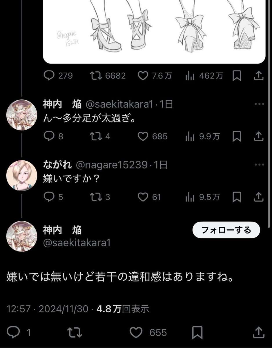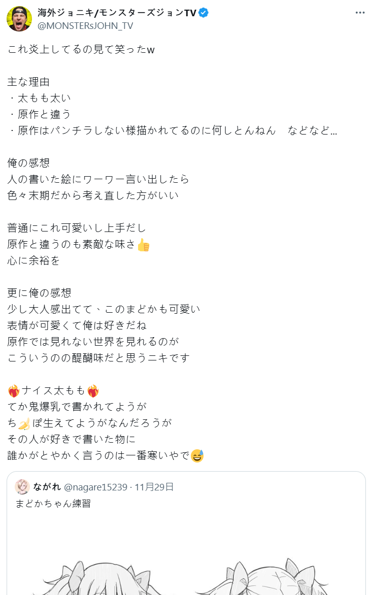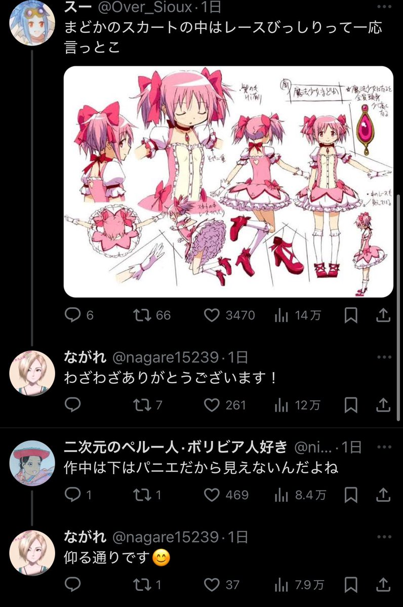 事實上繪師ながれ過往繪製不少《魔法少女小圓》插圖,有一般向的也有 R18 的帳號。不過這個帳號都是正常向,卻因為這張鹿目圓的插圖,引起部分網友不滿繪圖風格跟原作不一致,刻意露出內褲且又把腿畫得粗粗的,沒想這種繪師個人的風格卻遭批評,讓人感到困惑。