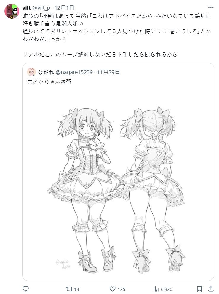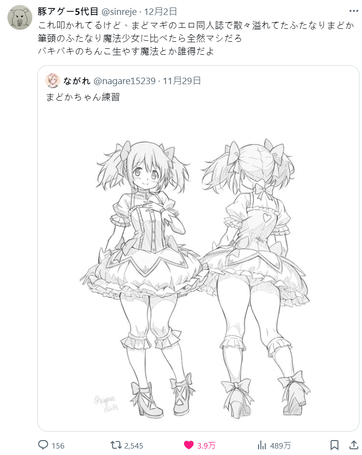 近日有位喜愛《魔法少女小圓》的繪師ながれ ( @nagare15239 ),分享自己繪製主角鹿目圓的插圖,卻被部分網友批評「大腿畫太粗」、「刻意露內褲」等原作不同的問題,這件事情也在網上掀起熱議,到底這樣是否合理。