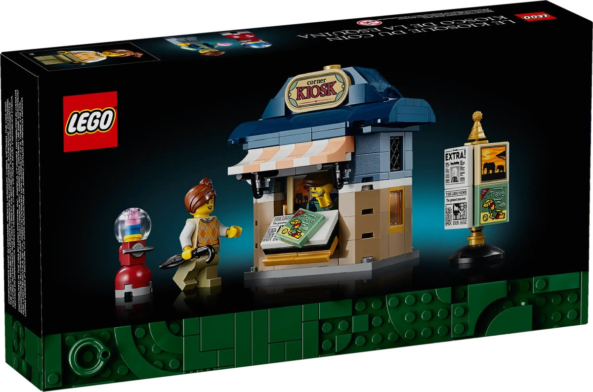 本作一共 205 片零件,組完之後可以得到一座裝飾著條紋遮陽棚的一人報攤(newsstand)、一個可以展示報章雜誌的報亭(kiosk),跟一款樣式復古的紅色口香糖機,報攤不僅擁有造型精美的屋頂跟 vintage 風格的好看招牌,遮陽棚的配色也十分少見,是在深色屋頂與建築外牆的配色中顯得獨特但不突兀的存在,口香糖機更是只用幾個零件就極為傳神,超級可愛;人偶包含一個蓄鬍的報攤老闆、一個手持雨傘的客人,整體彌滿著一股懷舊的復古時尚氣息,與都鐸式街角肯定是絕配。