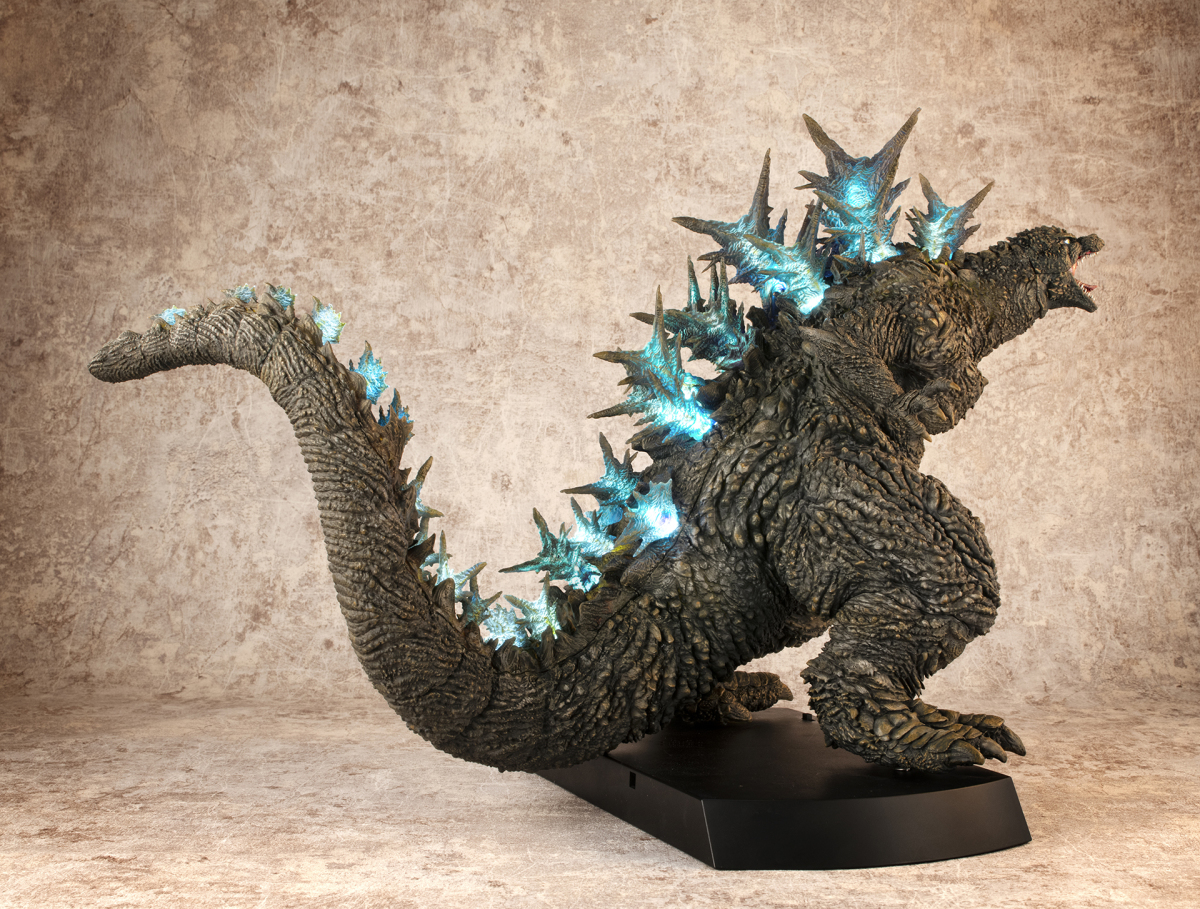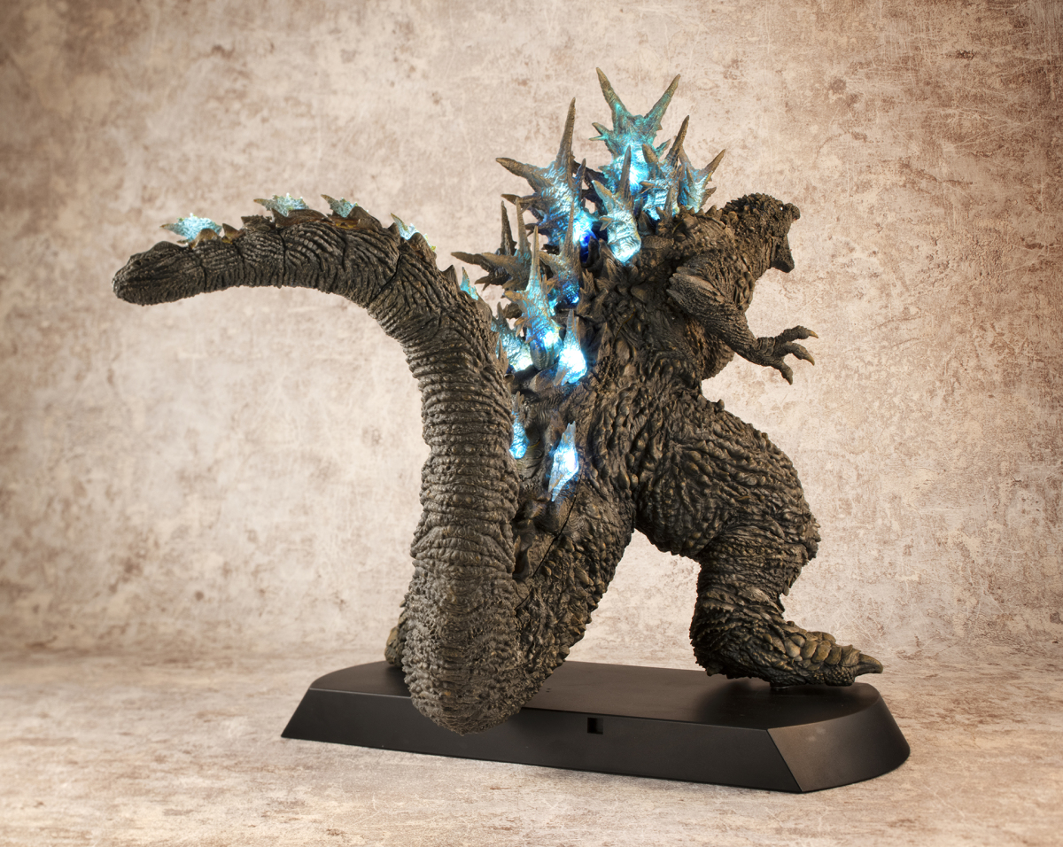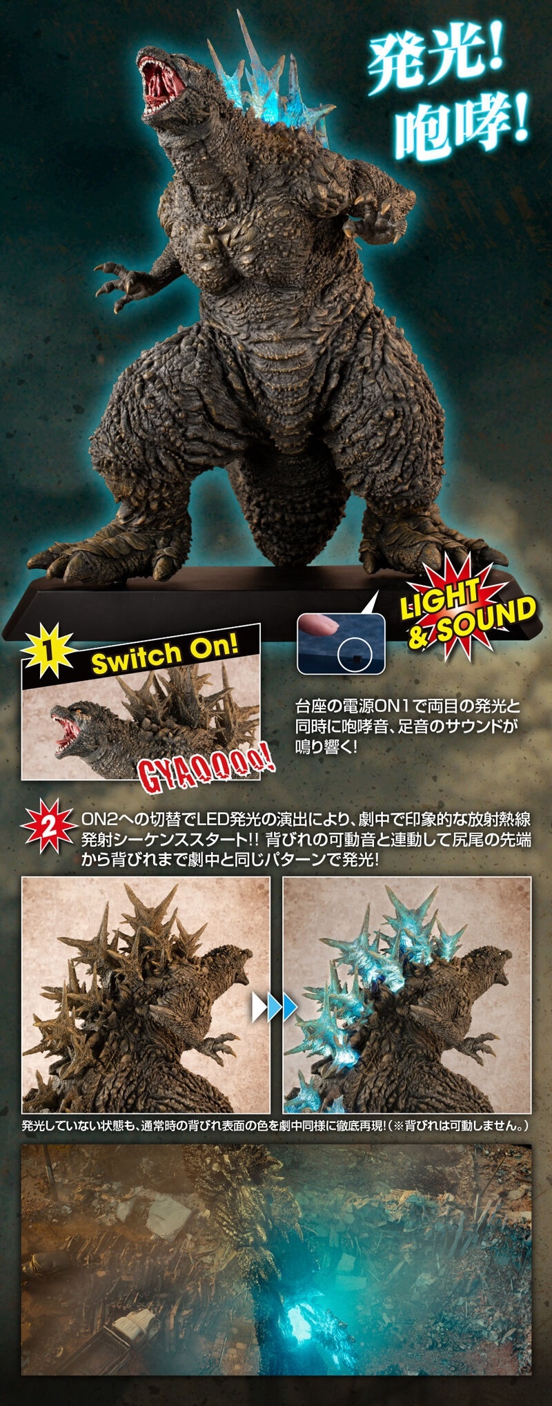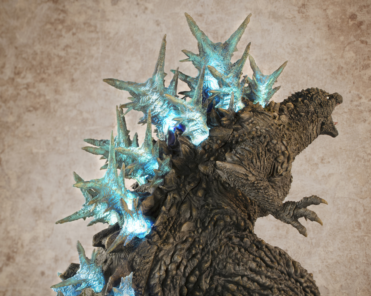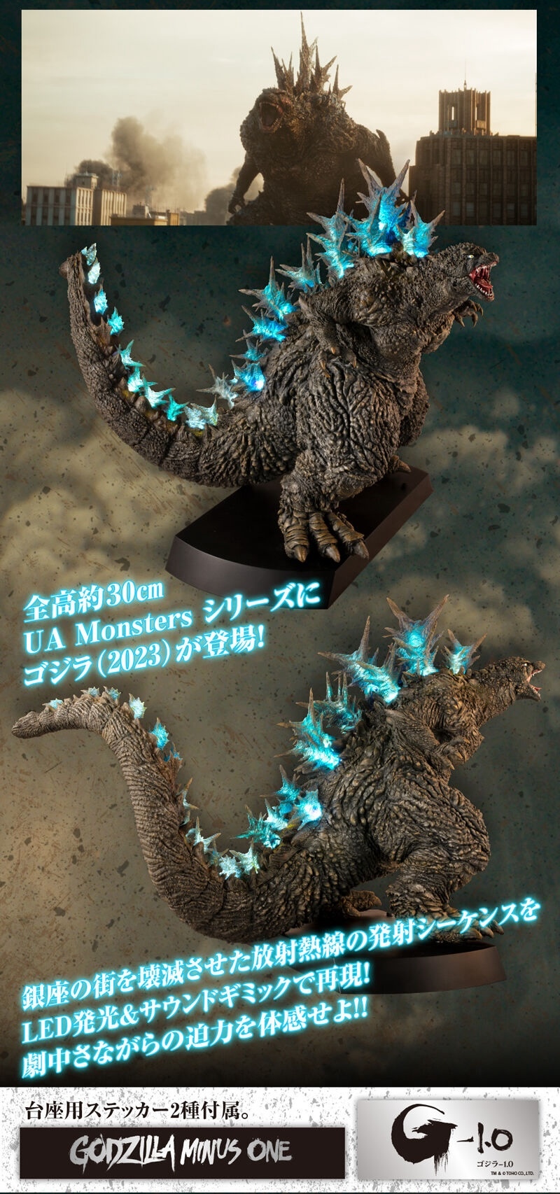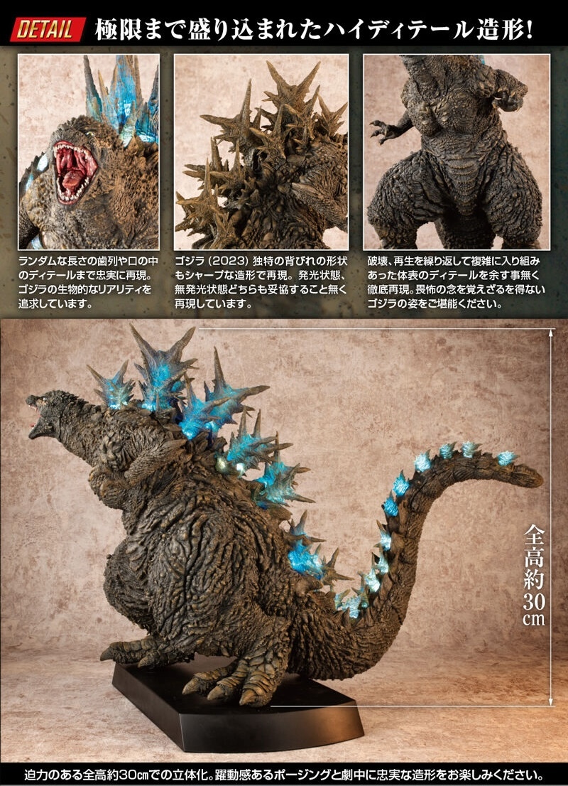 本次的「哥吉拉(2023)銀座強襲印象配色 Ver.」高約 30 公分,採用了與「海神行動印象配色 Ver.」相同的模型,雕刻出尖銳的背鰭與粗糙的表皮質感,配色部分參考了電影中哥吉拉襲擊銀座時身上沾滿塵土的土黃色調,再現令人絕望的身姿!而此版本最大的不同在於配備有 LED 發光及聲音特效,可以透過開關切換 ON1 和 ON2 兩種模式,在 ON1 模式下音效裝置會播放哥吉拉肆虐銀座時的腳步聲,而 ON2 模式則會以積攢能量的音效搭配發光效果,從尾部緩緩亮起延伸至背鰭與頭部,重現哥吉拉準備釋放放射熱線時的霸氣模樣!
