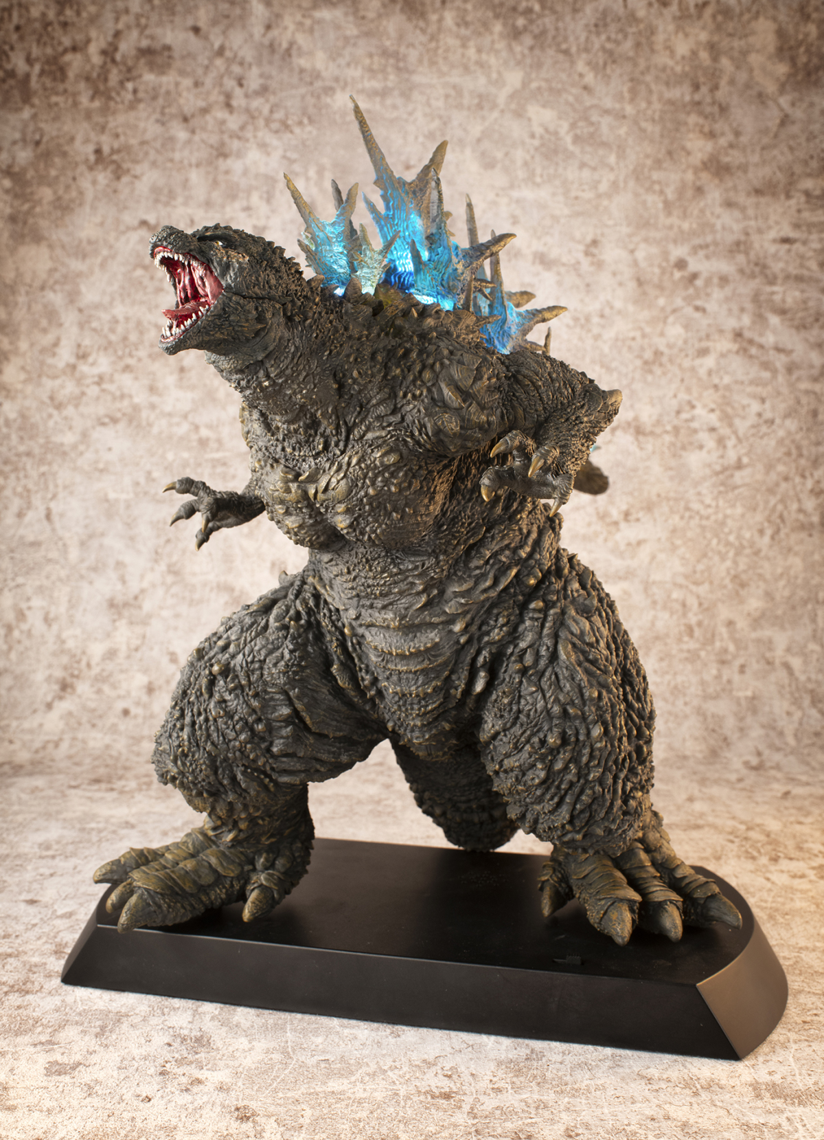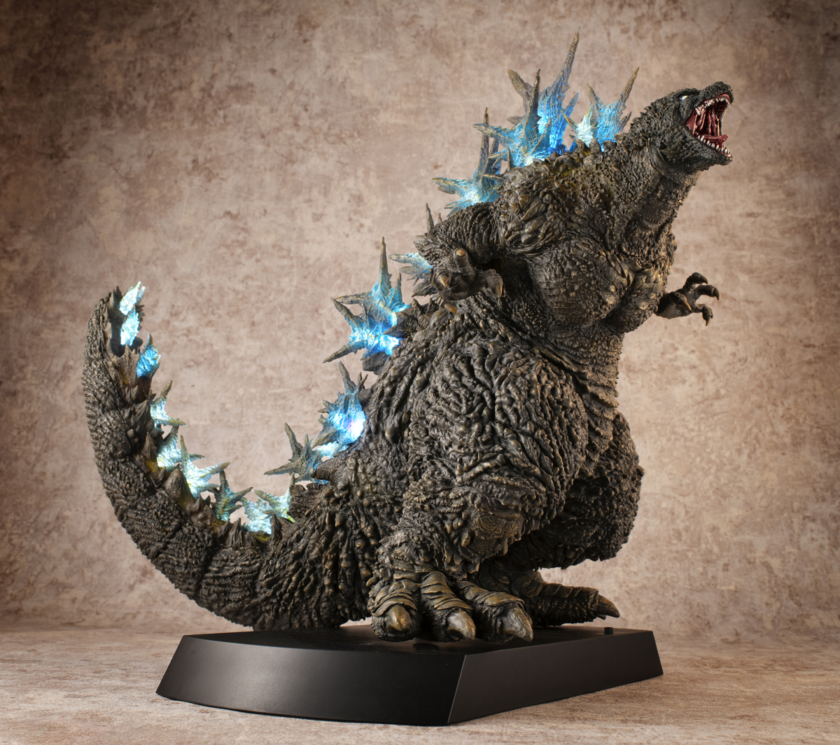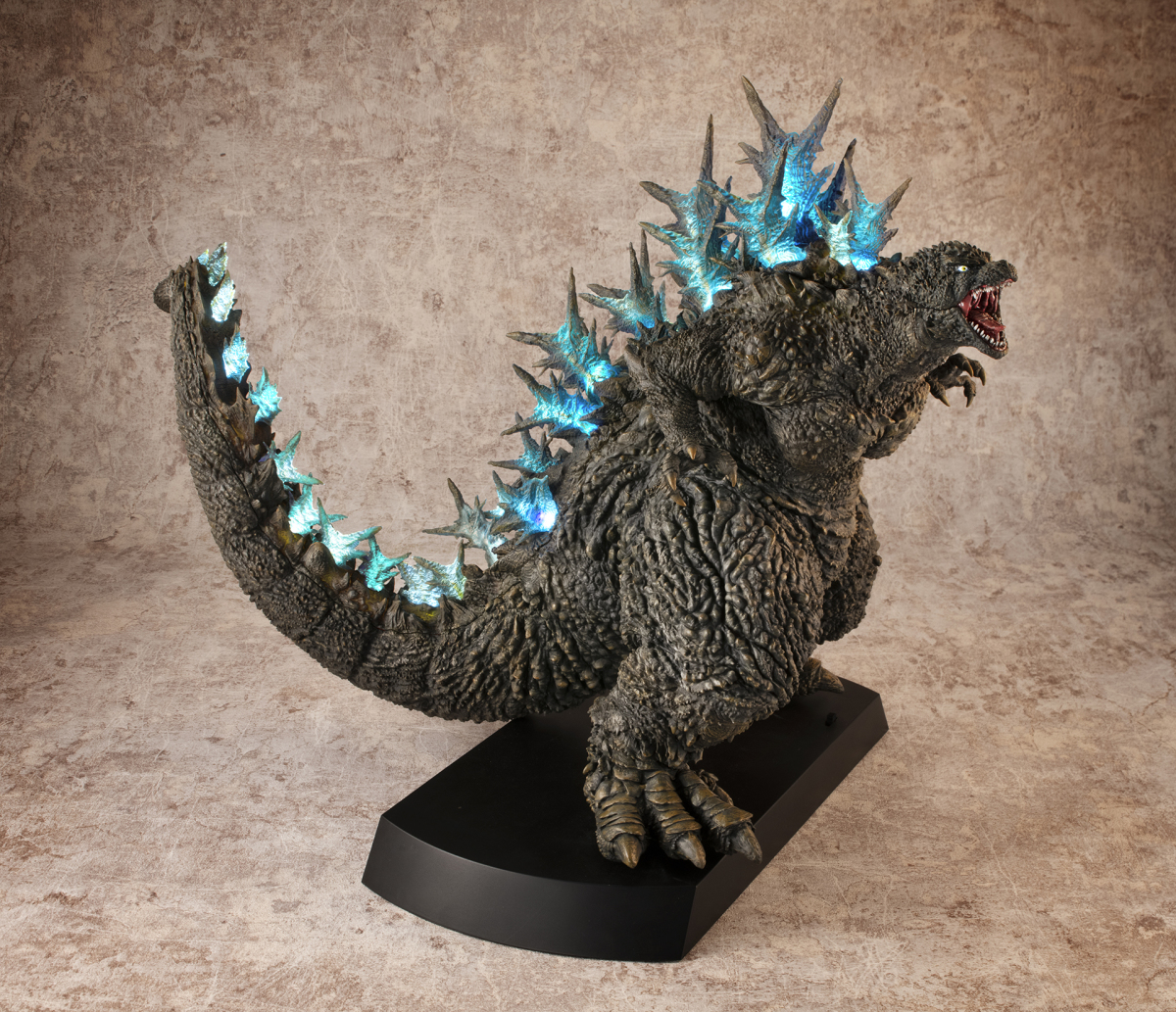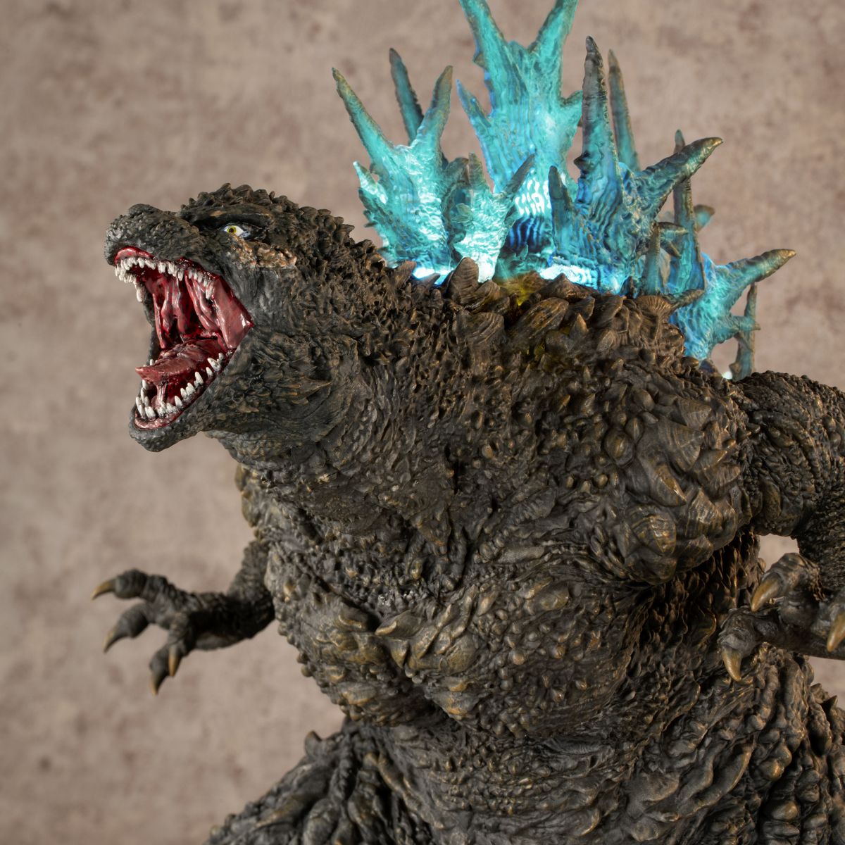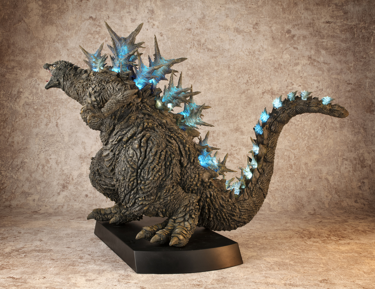 本次的「哥吉拉(2023)銀座強襲印象配色 Ver.」高約 30 公分,採用了與「海神行動印象配色 Ver.」相同的模型,雕刻出尖銳的背鰭與粗糙的表皮質感,配色部分參考了電影中哥吉拉襲擊銀座時身上沾滿塵土的土黃色調,再現令人絕望的身姿!而此版本最大的不同在於配備有 LED 發光及聲音特效,可以透過開關切換 ON1 和 ON2 兩種模式,在 ON1 模式下音效裝置會播放哥吉拉肆虐銀座時的腳步聲,而 ON2 模式則會以積攢能量的音效搭配發光效果,從尾部緩緩亮起延伸至背鰭與頭部,重現哥吉拉準備釋放放射熱線時的霸氣模樣!