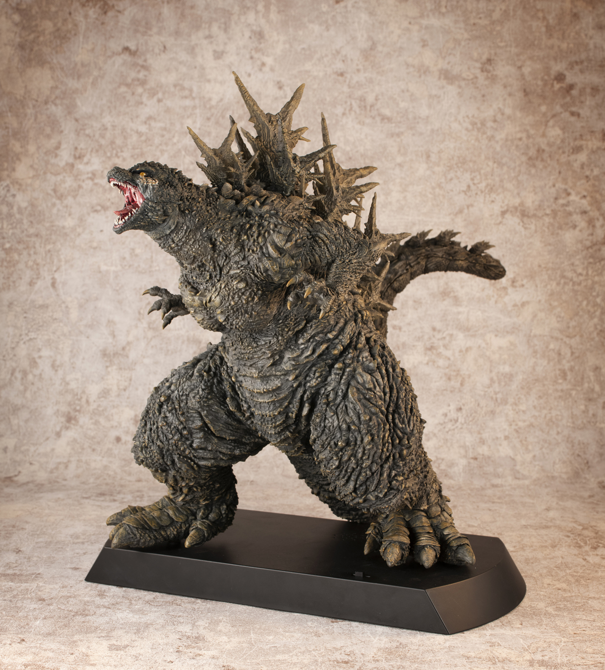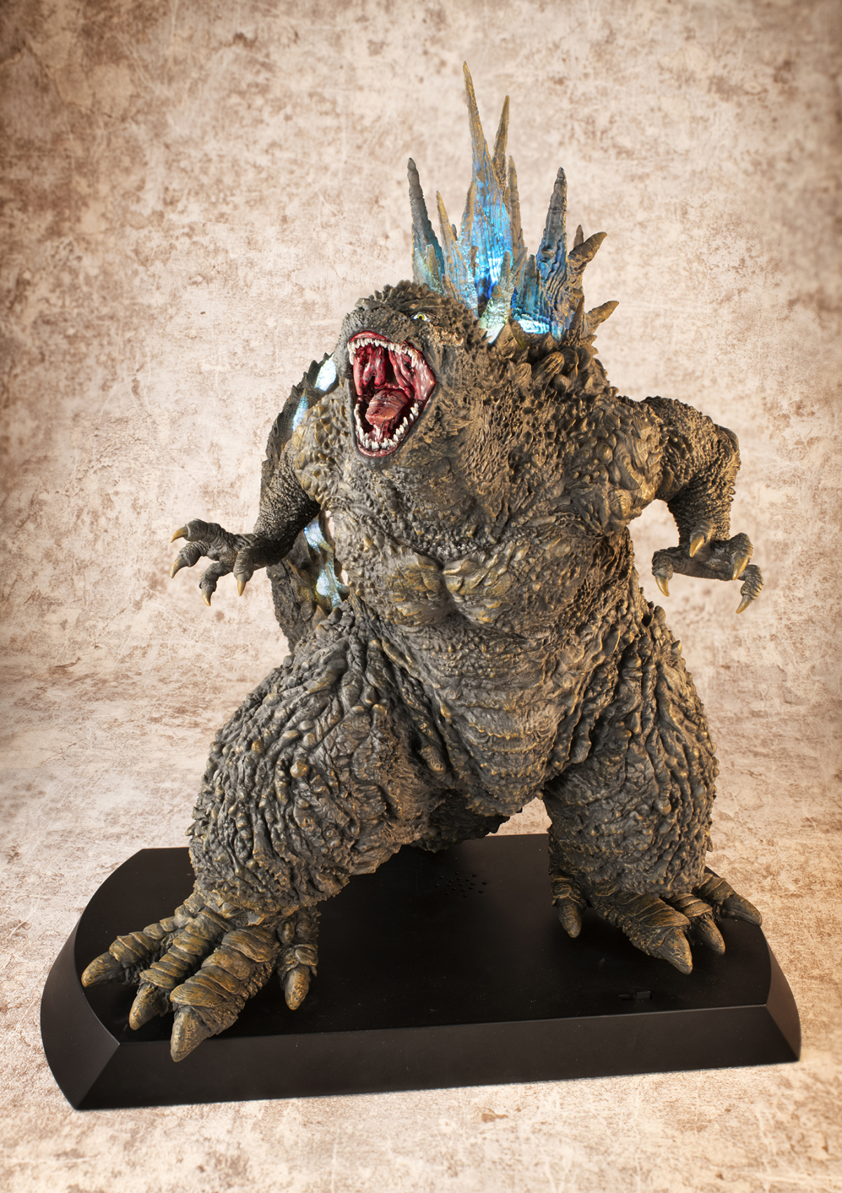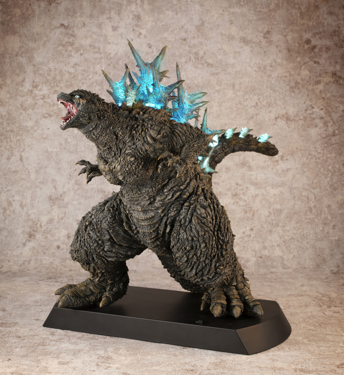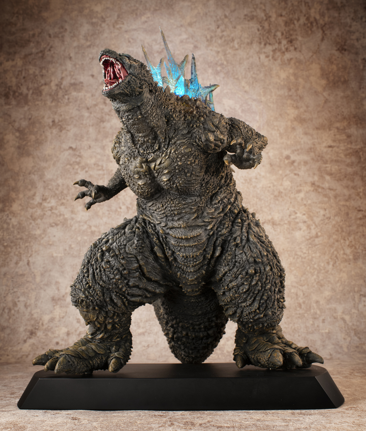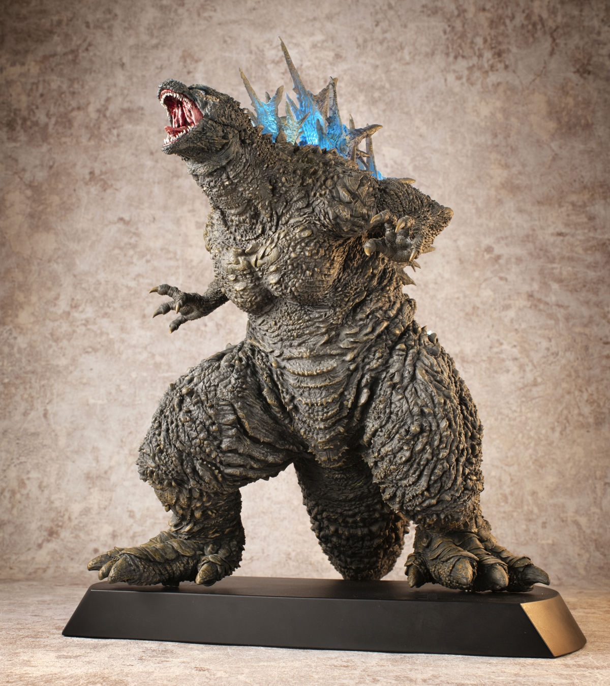 本次的「哥吉拉(2023)銀座強襲印象配色 Ver.」高約 30 公分,採用了與「海神行動印象配色 Ver.」相同的模型,雕刻出尖銳的背鰭與粗糙的表皮質感,配色部分參考了電影中哥吉拉襲擊銀座時身上沾滿塵土的土黃色調,再現令人絕望的身姿!而此版本最大的不同在於配備有 LED 發光及聲音特效,可以透過開關切換 ON1 和 ON2 兩種模式,在 ON1 模式下音效裝置會播放哥吉拉肆虐銀座時的腳步聲,而 ON2 模式則會以積攢能量的音效搭配發光效果,從尾部緩緩亮起延伸至背鰭與頭部,重現哥吉拉準備釋放放射熱線時的霸氣模樣!