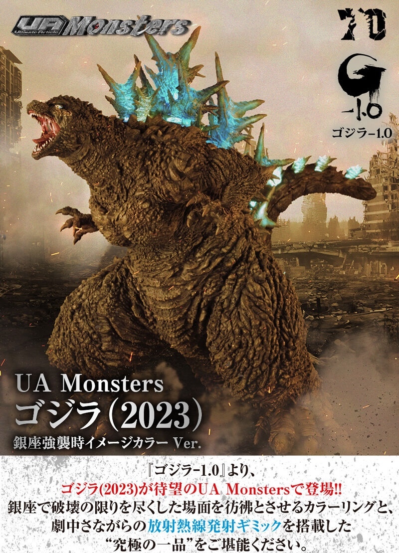 日本 Megahouse 玩具公司旗下主打兼具大尺寸與聲光效果的「UA Monsters」系列本次除「哥吉拉(2023)海神行動印象配色 Ver.」外也將同步推出另一件電影《哥吉拉 -1.0》主題的新商品——「哥吉拉(2023)銀座強襲印象配色 Ver.」,參考售價為 44,000 日圓,預計於 2025 年 06 月下旬發售!