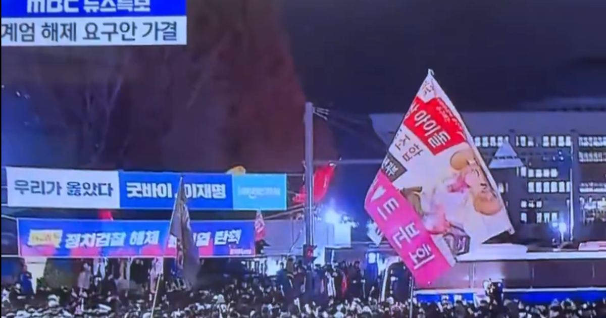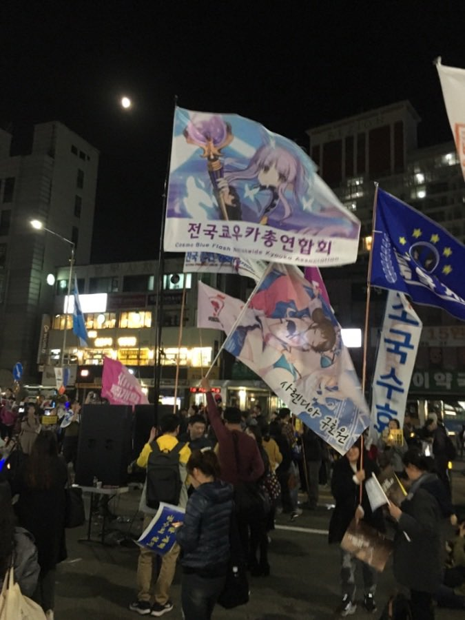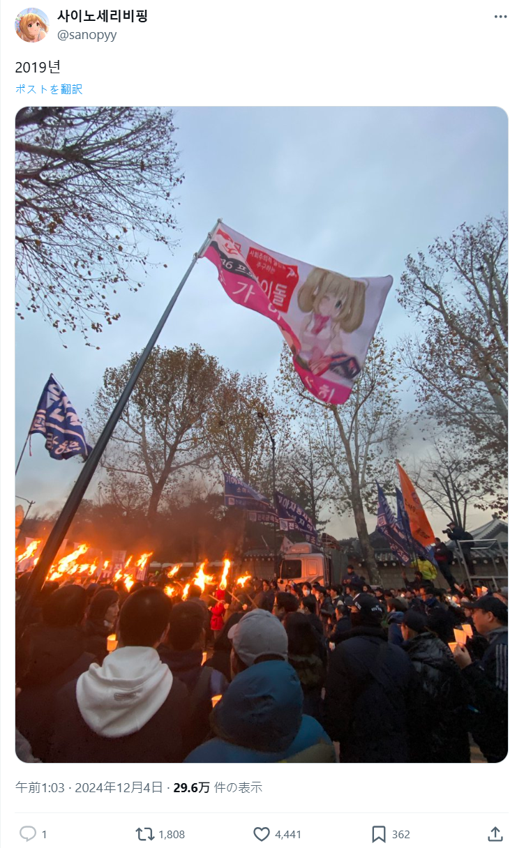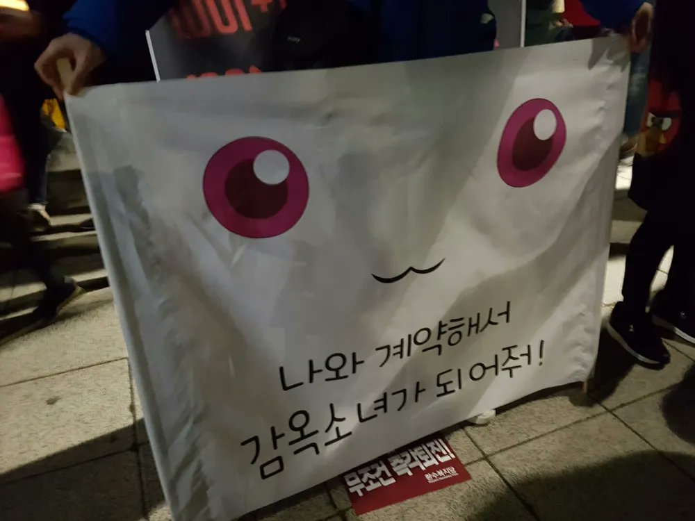 從新聞畫面來看,《偶像大師灰姑娘女孩》佐藤心的旗子超級顯眼,飄揚在戒嚴時間人民聚集的國會前廣場,連韓國網友都大感奇妙,怎麼會有這種東西出現在這裡ㅋㅋㅋ。