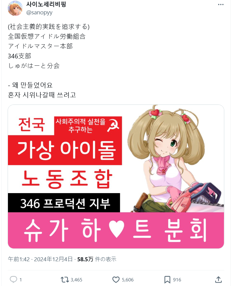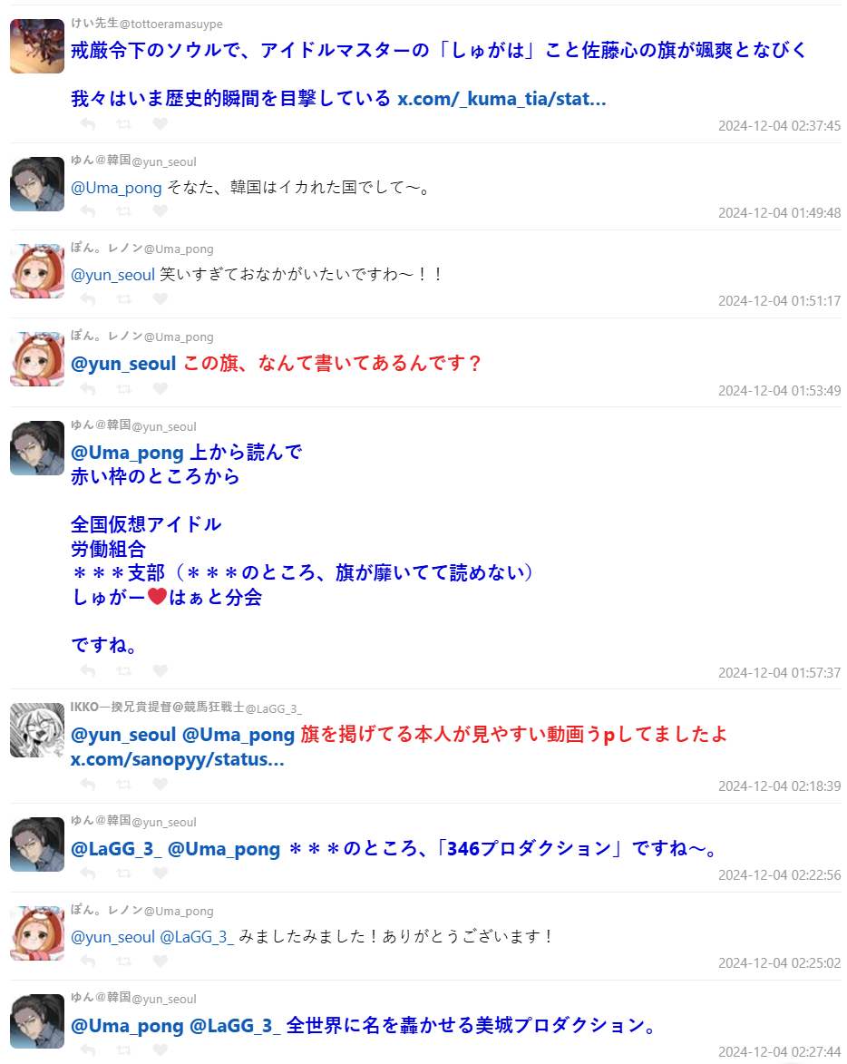 這神奇的舉動也被日本網民關注到,沒想到陷入社會動盪的時刻,居然還有人舉起《偶像大師灰姑娘女孩》的 346 Production 旗幟,雖然很荒謬,但真的難以想像韓國民眾到底以什麼心態看待 www。