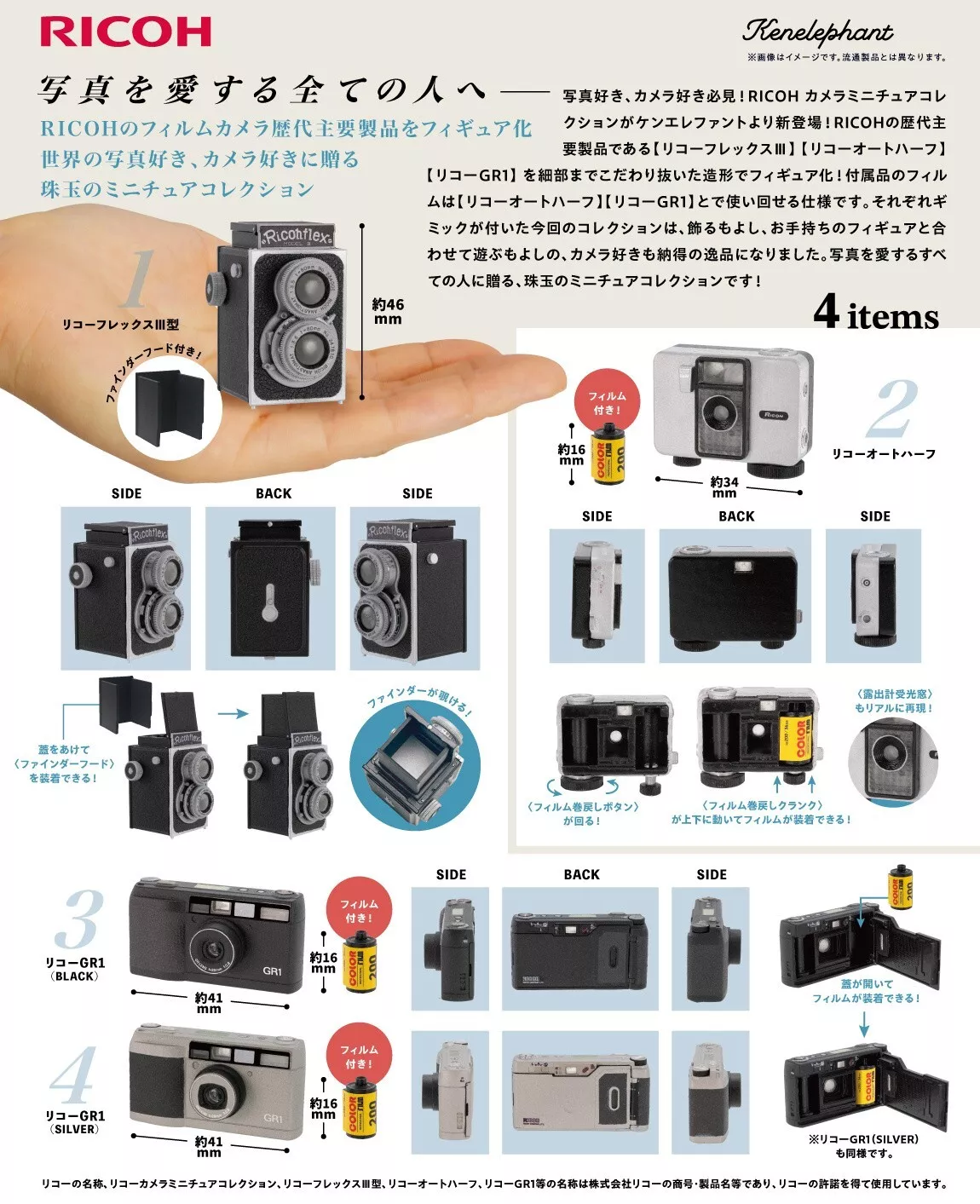 本次 Kenelephant 將 RICOH 過去生產的四款經典底片機製作為約 3.4~4.6 公分大的迷你模型,收錄 1950 年發售的 Ricohflex III 雙反相機、1960 年發售的 Ricoh Auto Half 半格機及黑、白兩色的 1996 年發售的 Ricoh GR1 可攜式相機!Ricohflex III 的上蓋可以開啟安裝遮光罩,而 Auto Half 和 GR1 則都可以打開後蓋安裝配件附上的底片,以有趣的巧思再現底片機的樂趣,各位 RICOH 粉千萬不要錯過!