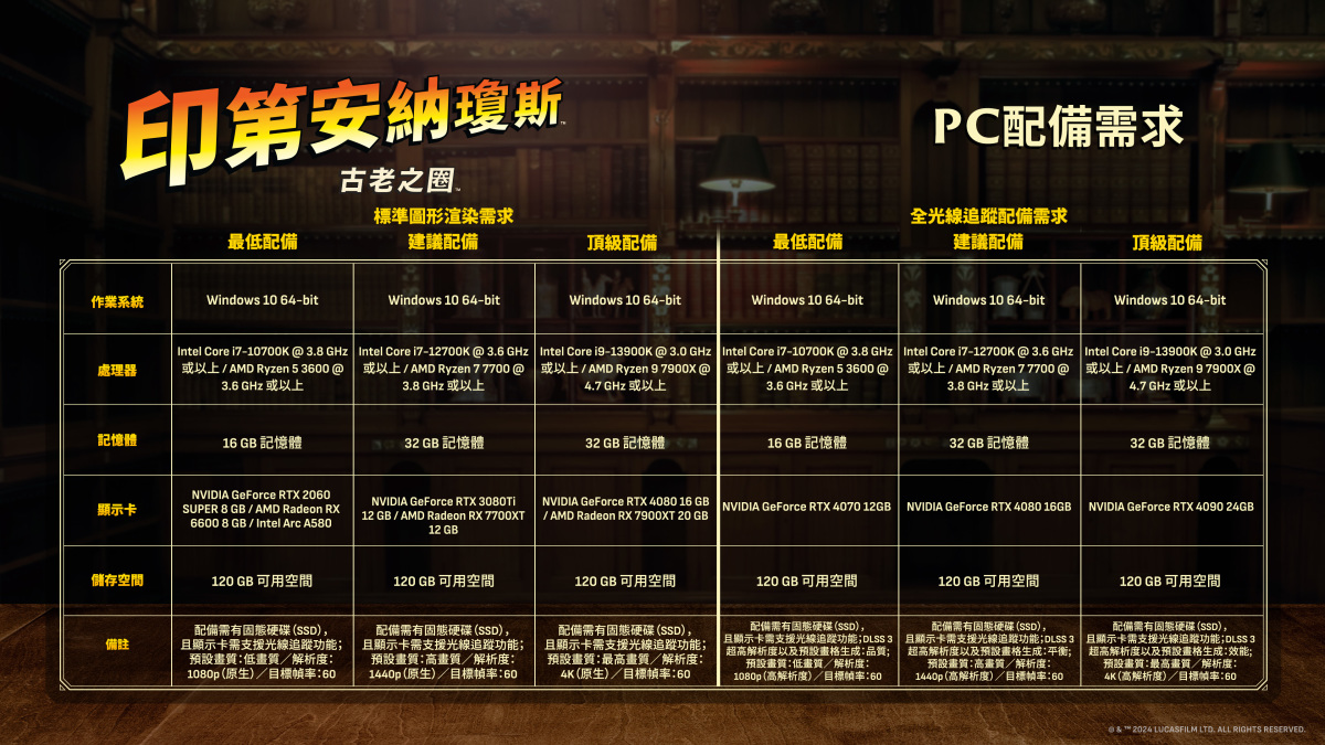 從官方公布的PC配置需求,顯卡最低為RTX 2060 SUPER/RX 6600,而建議配置則RTX 3080Ti/RX 7700XT,且記憶體至少也要配到16G,才能夠順跑《印第安納瓊斯:古老之圈》。