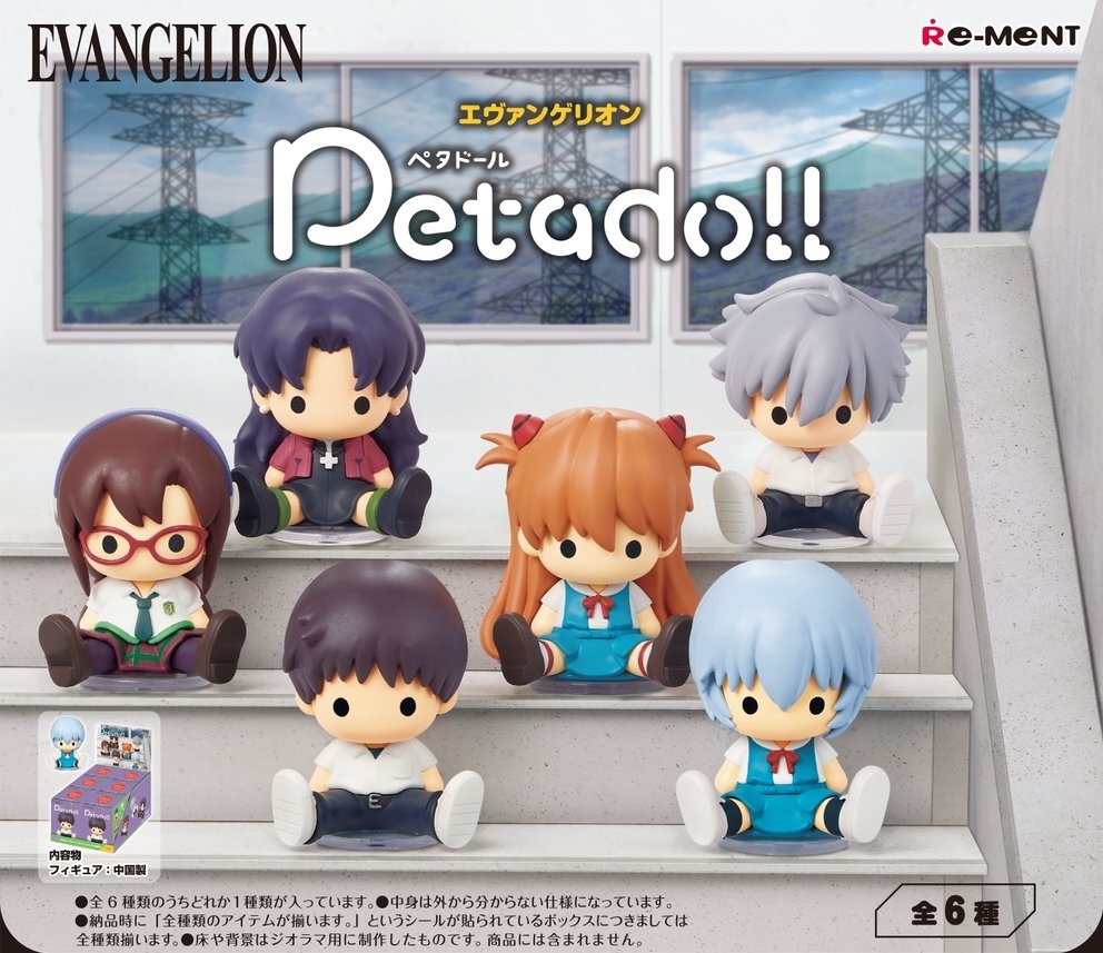 新世紀福音戰士加入了人氣的豆豆眼人偶 petadoll 系列啦!這次 RE-MENT 將作品中的主角群製作成了約 2.5 頭身的豆豆眼坐姿人偶,收錄真嗣、凌波零、明日香、真希波、渚薰以及葛城美里六種款式,駕駛員們都採用了學生制服造型,美里則是採用了經典的紅色外套搭配貝雷帽的模樣,每款都在 Q 版的比例下還原了句中的造型細節,而官方圖片的樓梯看起來是參考了新劇場版的海報插圖,排排坐的模樣看起來超級可愛!