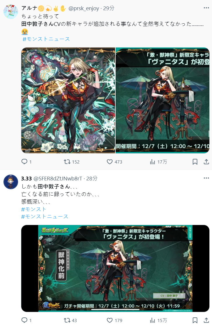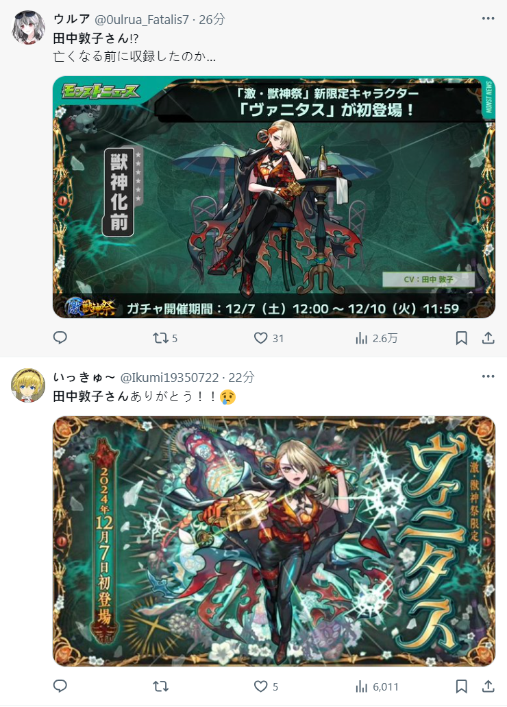 沒想到手遊《怪物彈珠》今日 ( 12/5 ) 公布了最新「激獸神祭」轉蛋活動的限定角色「ヴァニタス」,配音居然是已故的田中敦子,讓不少玩家粉絲感到驚訝,驚呼這應該是她生前錄製的最後角色,也成為 X 上的熱議話題。