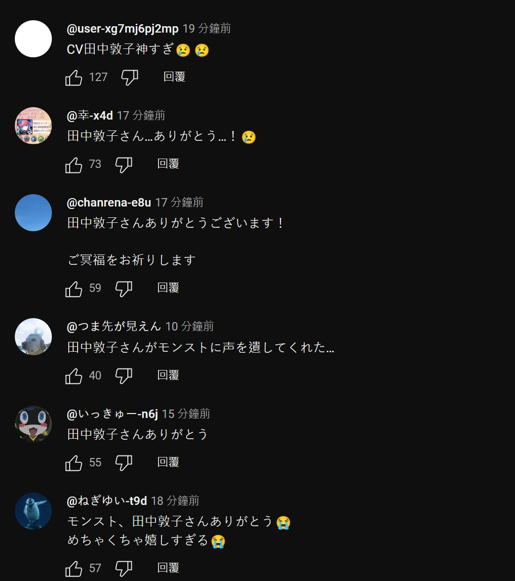 畢竟已經過世的田中敦子,可說是在過世前都仍活躍在一線的資深聲優,配音的角色更是無數人的回憶,沒想到在手遊中還能聽到她配音新角色,真的太揪心了 QQ。