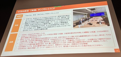 針對這樣的事情,山田太郎議員在 2023 年 8 月曾訪問美國 Visa 總部,並獲得回應稱:「我們不對合法內容進行價值判斷」」。此外,針對成人向內容,他們表示:「我們有兩項全球通用的標準:(1)遵守年齡規範,不涉及兒童色情內容;(2)內容是基於同意的提供。但針對具體內容,我們並未制定標準或進行判斷。」Visa也提到,本公司僅制定基本規範,具體判斷是由現場相關單位負責。