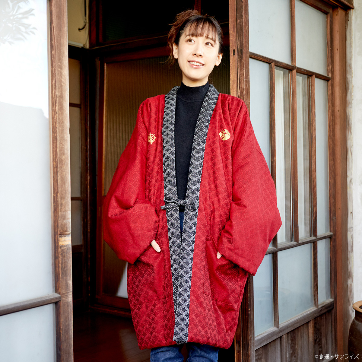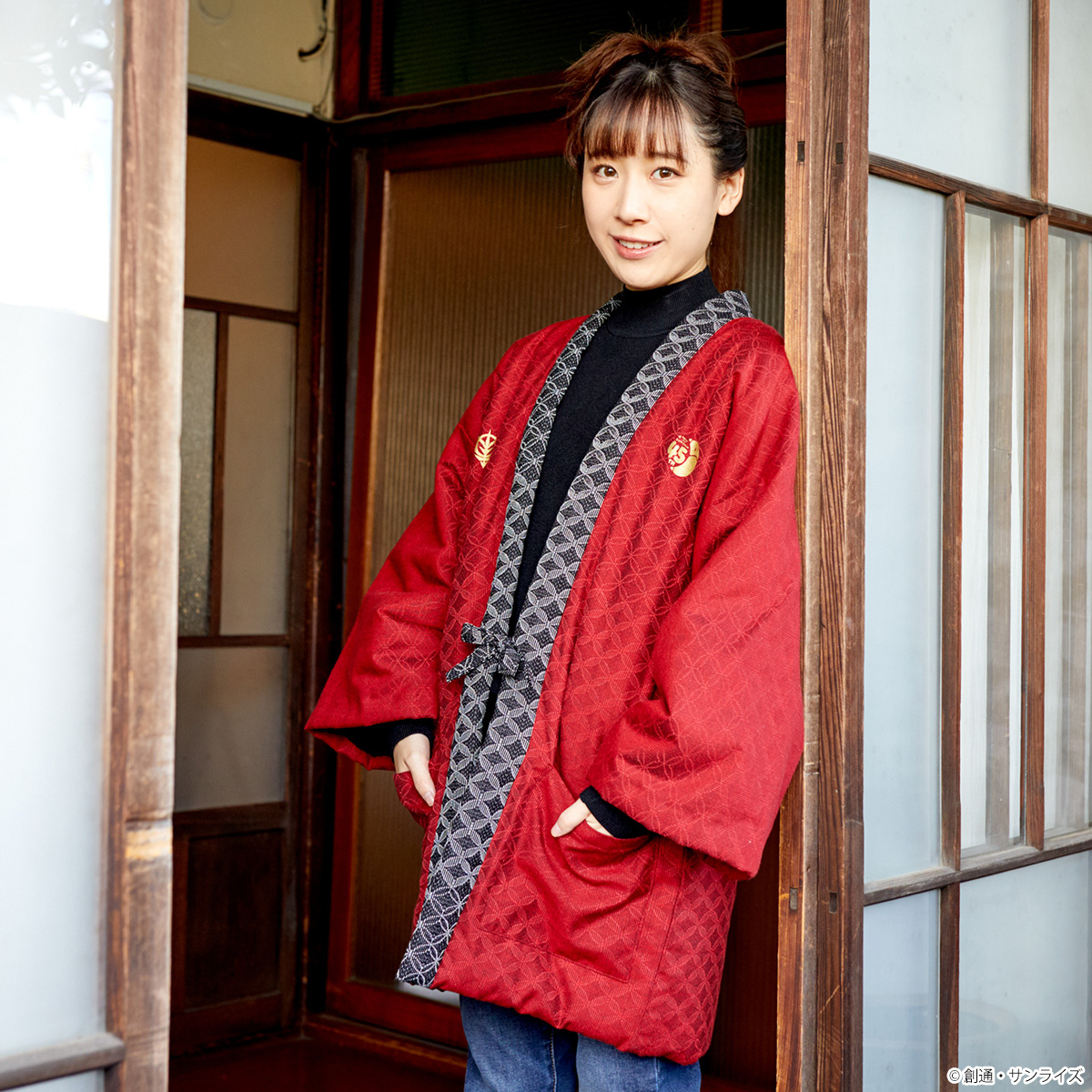 選用了稍微現代化的素材、顏色與款式,重新設計了傳統的棉入半纏。袖下的裁剪讓整體更加修身,展現典雅又復古的氣質。外層布料採用了被認為象徵吉祥、經常用於喜慶場合的傳統「七寶紋」。