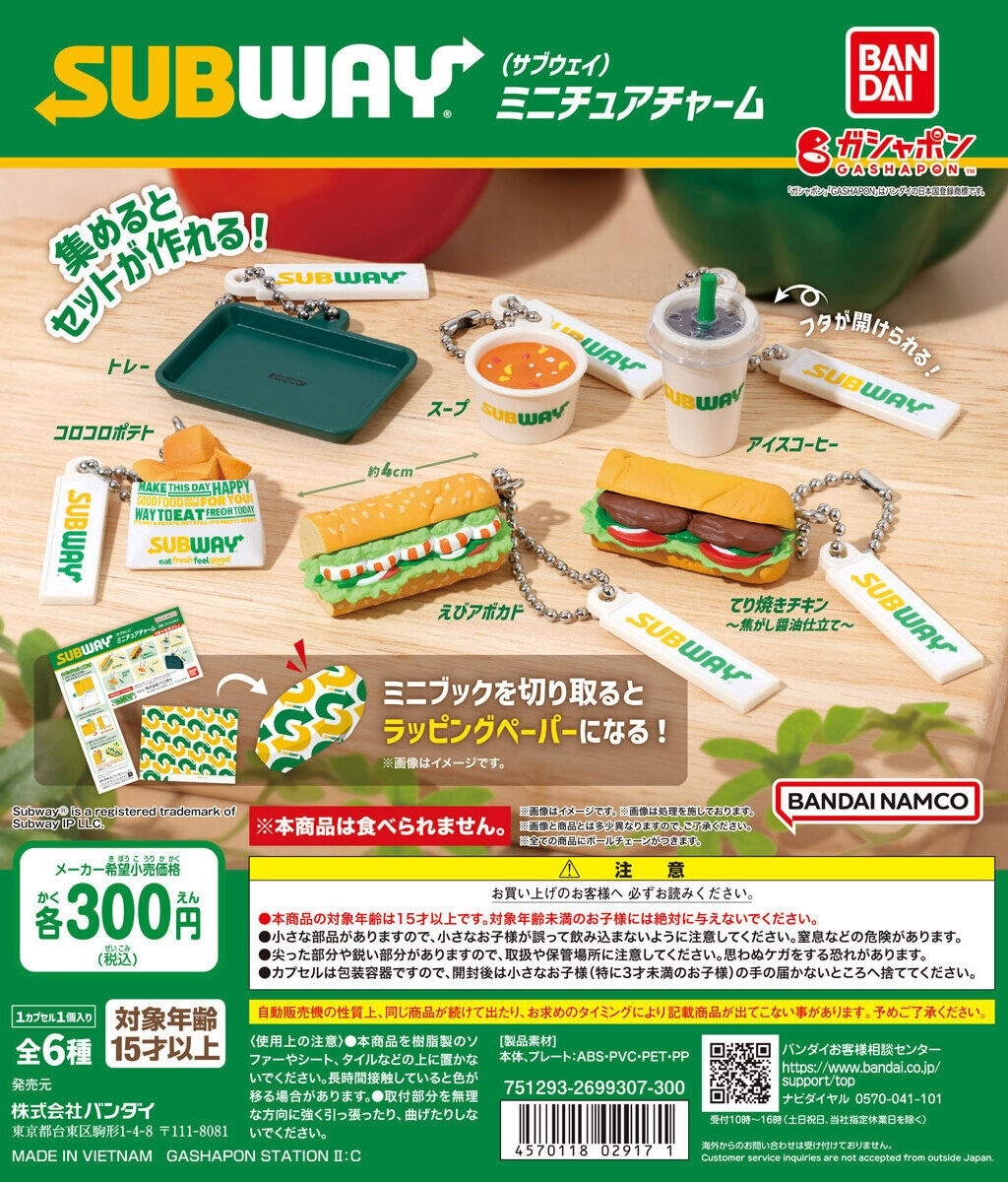 日本萬代公司轉蛋事業部 GASHAPON 與美國知名速食連鎖餐廳 SUBWAY 合作推出全新商品——「SUBWAY 迷你吊飾」轉蛋,參考售價為每轉 300 日圓,預計於 2024 年 12 月第三週發售!
