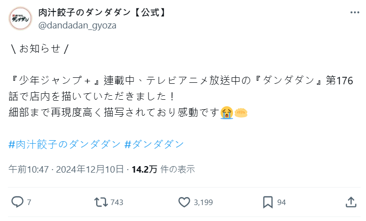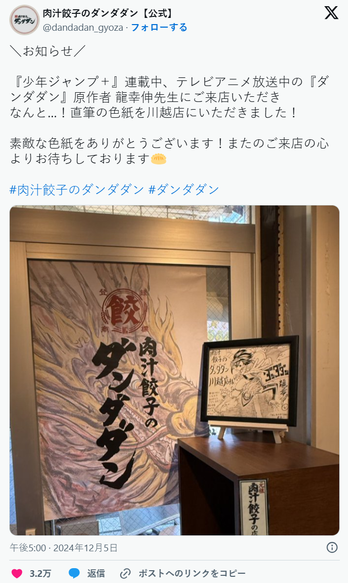 近日漫畫更新了第 176 話,劇中角色們前往的這家餐廳「肉汁餃子のダンダダン」,實際上在日本可說是非常人氣的連鎖店鋪,店家也貼出龍幸伸前去造訪的照片,留下直筆簽名的色紙,讓粉絲大讚兩個「ダンダダン」終於夢幻碰面。