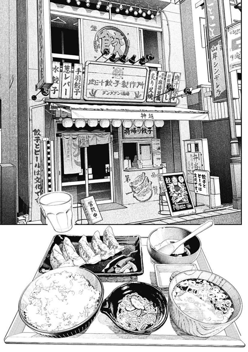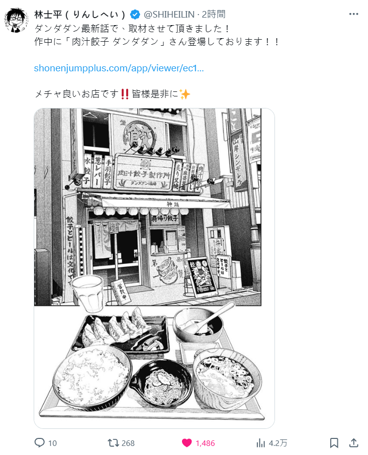 可以看到第 176 話繪製的「肉汁餃子のダンダダン」,不僅店內外外觀、裝潢以及所享用的餐點都非常精緻描繪,用心至極連店家都發文為此感謝。