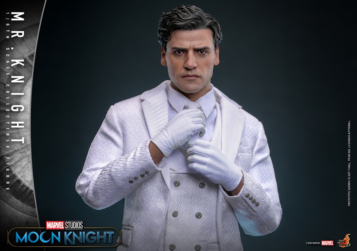 本次的「騎士先生」1/6 比例收藏級可動人偶高約 29 公分,全身作有 30 處可動,以新規雕刻還原演員奧斯卡·伊薩克(Óscar Isaac)的精緻面容,眼睛部分作有轉動功能可以微調史蒂芬的視線,並附有另一顆作有 LED 發光功能的騎士先生面罩,可以完整重現他變身後的模樣!服裝部分以布料材質製作騎士先生修身剪裁的三件式西裝造型,西裝面料突顯人字紋細節,並在西裝外套和馬甲上裝飾了帶有古代符號的鈕扣,包裹繃帶設計的白靴也被細緻再現!