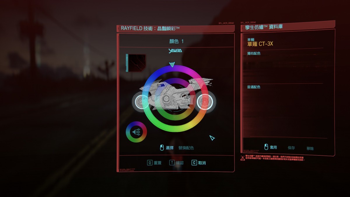 首先是「車子自定義外觀」,在2024年2月,CD Projekt Red為《電馭叛客2077》世界觀裡的高級汽車品牌Rayfield,追加了名為「晶豔瞬彩」的功能,改變汽車烤漆顏色、燈光色調後,這項功能也追加到了其它品牌載具上,包含Herrera、水谷、Quadra、Villefor等,都能夠利用「晶豔瞬彩」來調整成自己所喜歡的顏色。