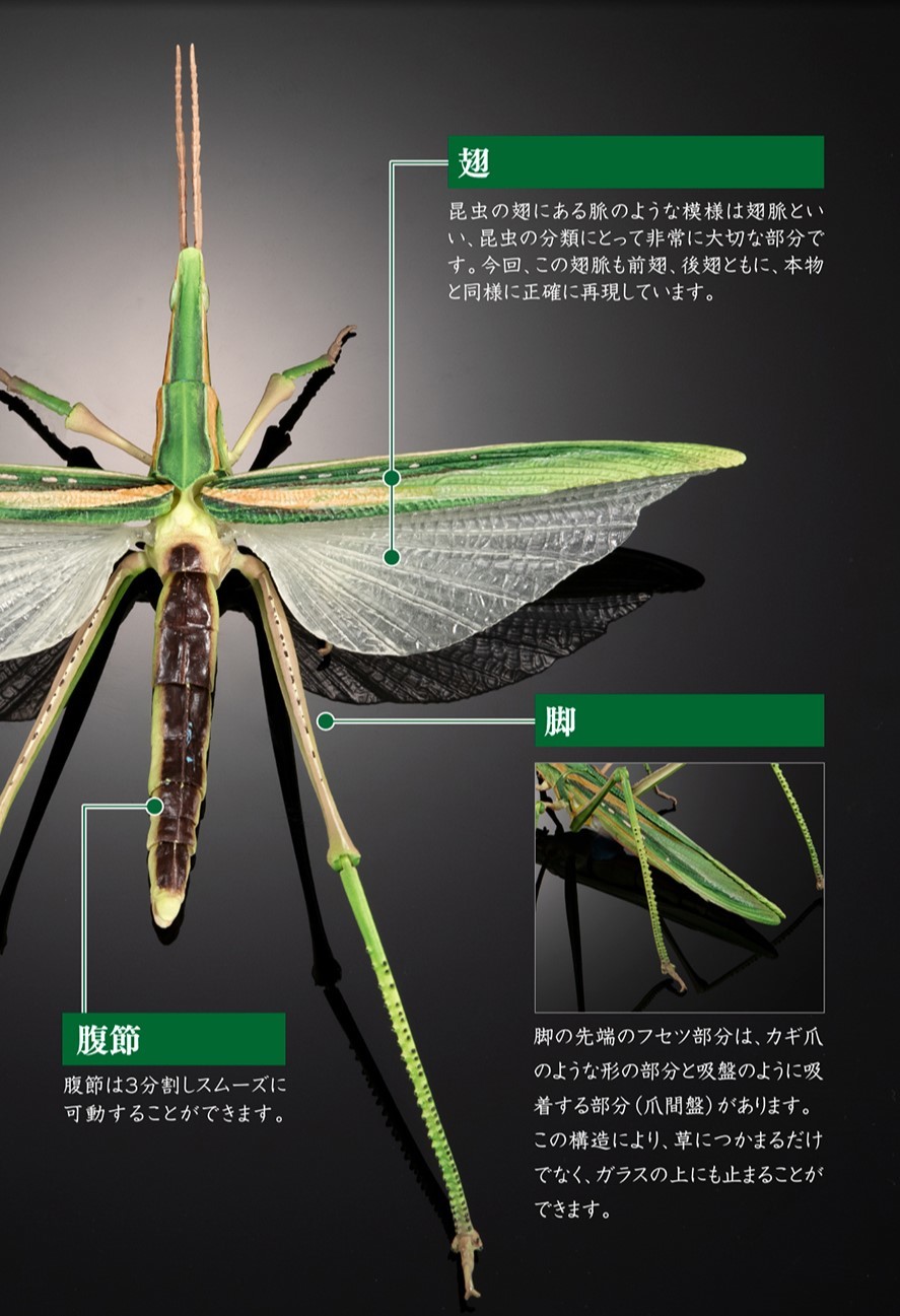 中華劍角蝗尺寸約 140 mm,共 21 處可動關節。展示架套組配有後翼,不僅可以以飛行姿勢展示,還可以呈現威嚇姿態!