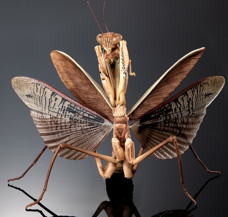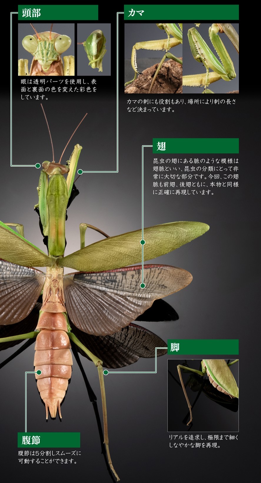 枯葉大刀螳採用比實體更大兩倍的份量尺寸,全長約 160 mm,並設計有 34 處可動關節,由JMC株式會社進行 X 光 CT 掃描徹底還原標本的造型,田中寬晃擔任精彩的塗裝,仔細還原各處極為擬真的細節!以透明材質打造的複眼與薄翼後翅相當精細,鐮刀狀的前肢棘刺、平常藏在翅膀底下的腹節等細節也極為生動地再現。