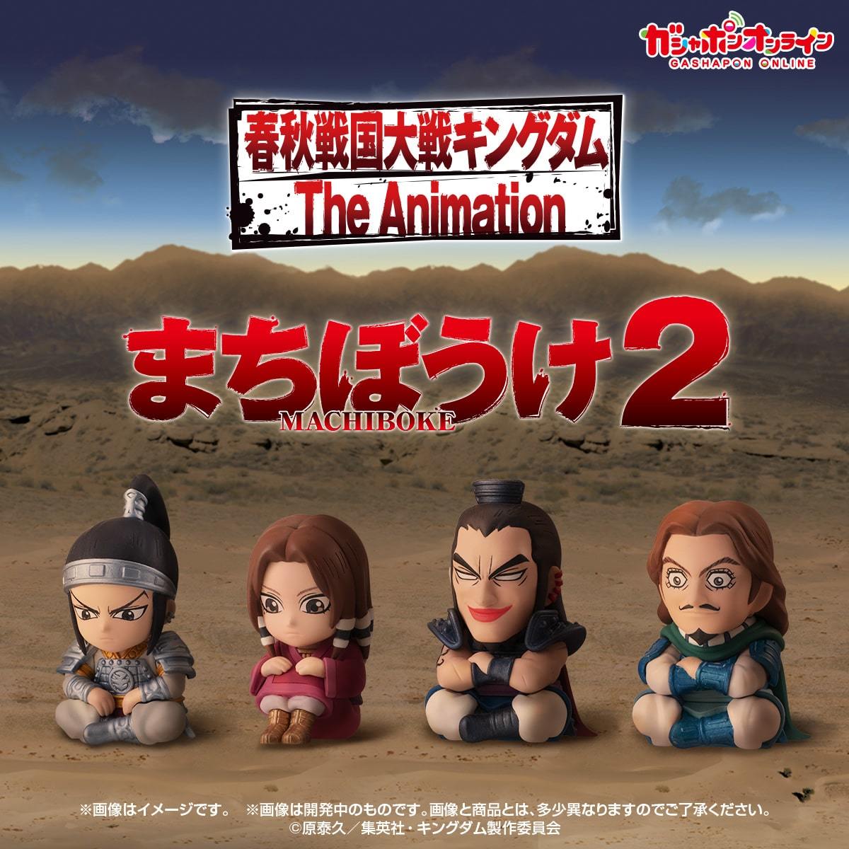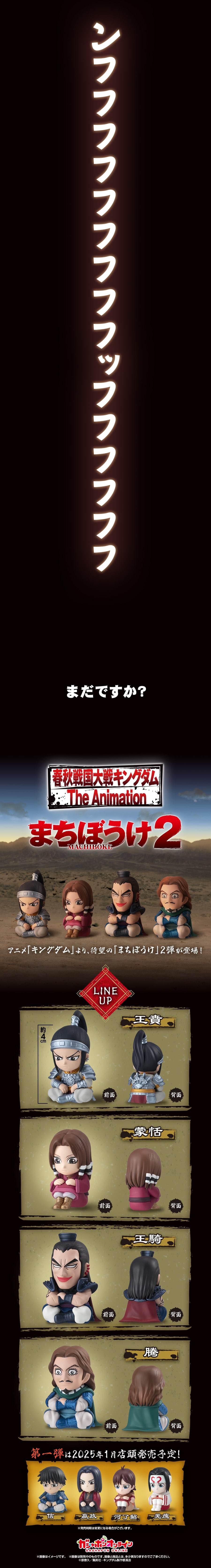 由日本萬代玩具公司旗下轉蛋事業部 GASHAPON 發行的大人氣「苦苦等待 (暫譯,まちぼうけ) 」玩具系列在以《王者天下》動畫為題打造「苦苦等待的王者天下角色」(キングダム まちぼうけ)第一彈之後,又於 GASHAPON ONLINE 發售最新的第二彈商品!預計 2025 年 4 月下旬開始發貨,建議售價為每轉 400 日幣,一共有 4 種款式可以收集。