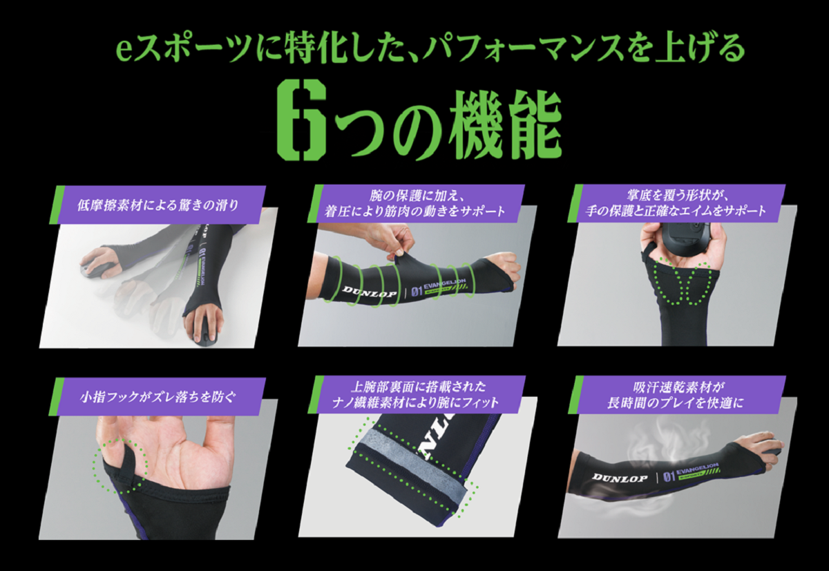 近日宣布與知名輪胎廠牌 DUNLOP 合作,推出專為電競玩家設計的 FPS /TPS 專用護臂,以專業的減壓機能搭配初號機的色系打造。售價為 5,500 日圓,目前可於 EVA STORE 上訂購。