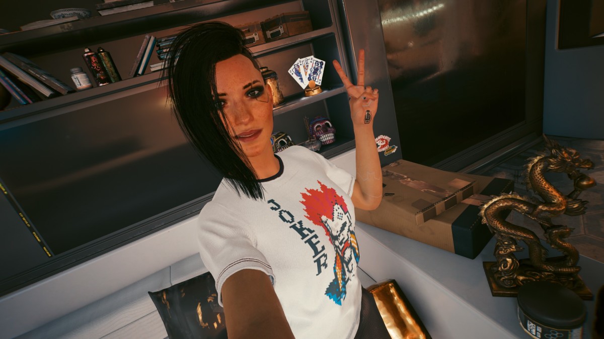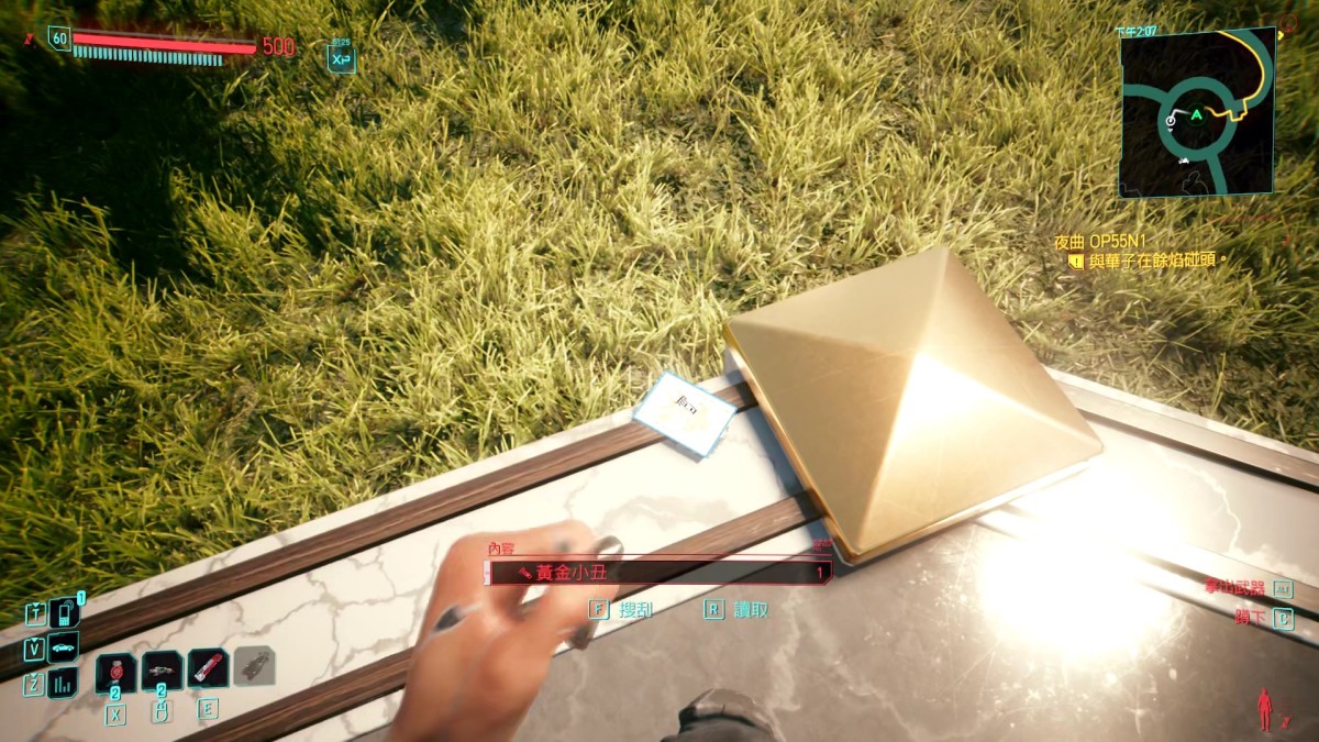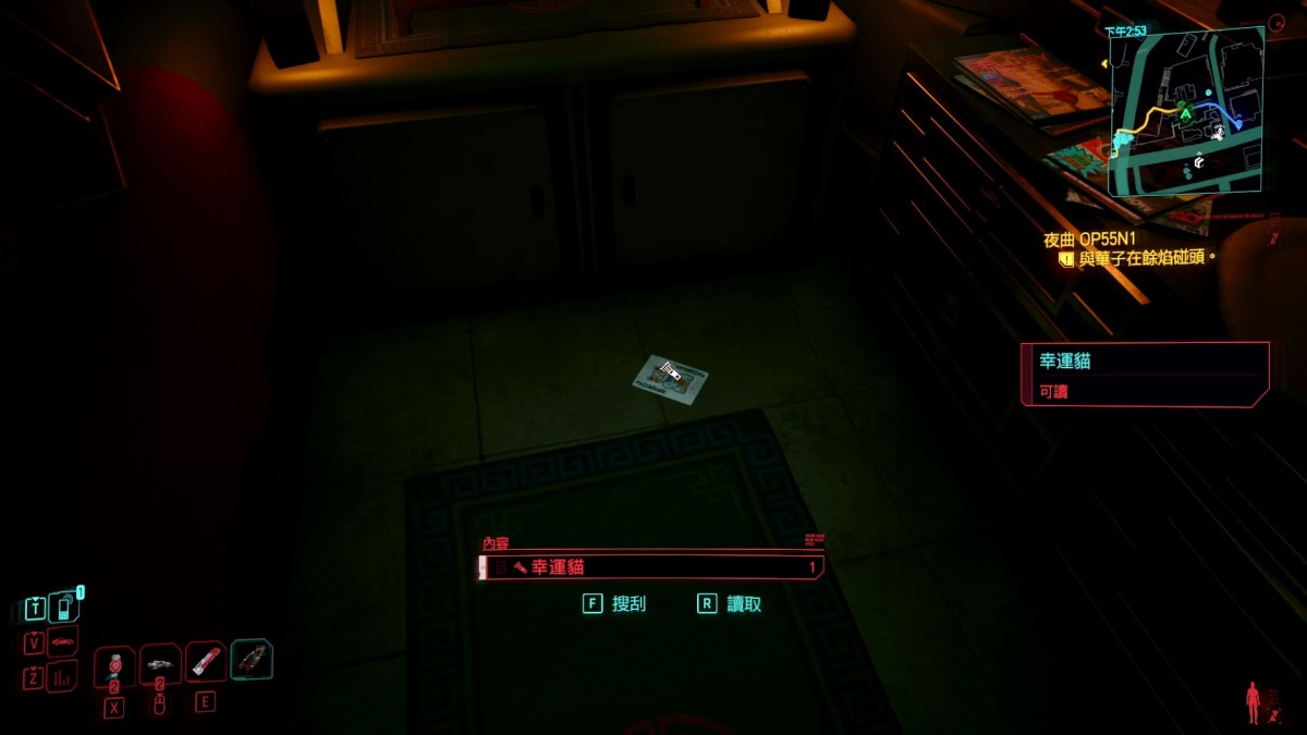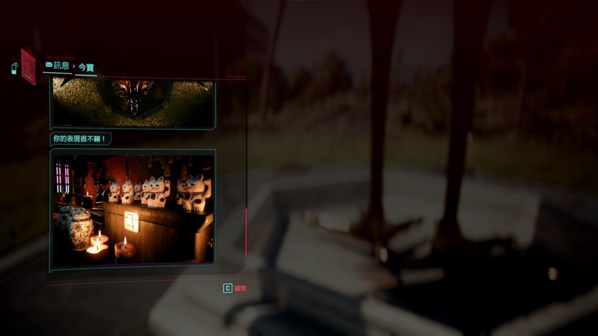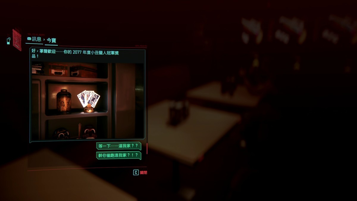 於是今寶就會告訴你——你獲得了「2077年度小丑獵人冠軍獎品」,也就是此次聯動任務中的新公寓擺設。此外,在你完成這次尋寶之旅的同時,記得撿起在櫻花市集餐館裡的禮物,那是這次活動送你的一件印有小丑標誌的白色紀念T恤。