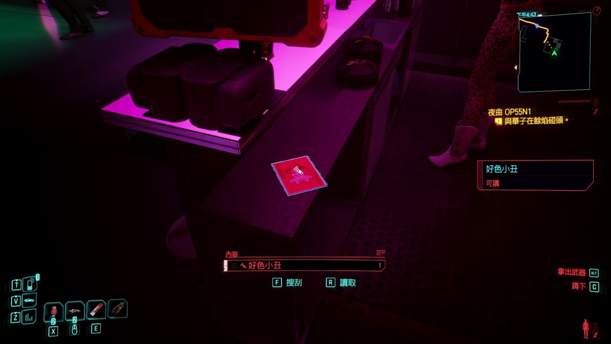 這個位置其實就在進入高潮街後的左邊第一家店內。我們從簡訊的指示圖可以看到,小丑標誌就在「24時間營業」的那面牆上,所以只要依照這個線索去尋找,就會發現櫃檯上放著一張「好色小丑」,拿起它後,就能夠解鎖最後一個ˋ指定線索了。
