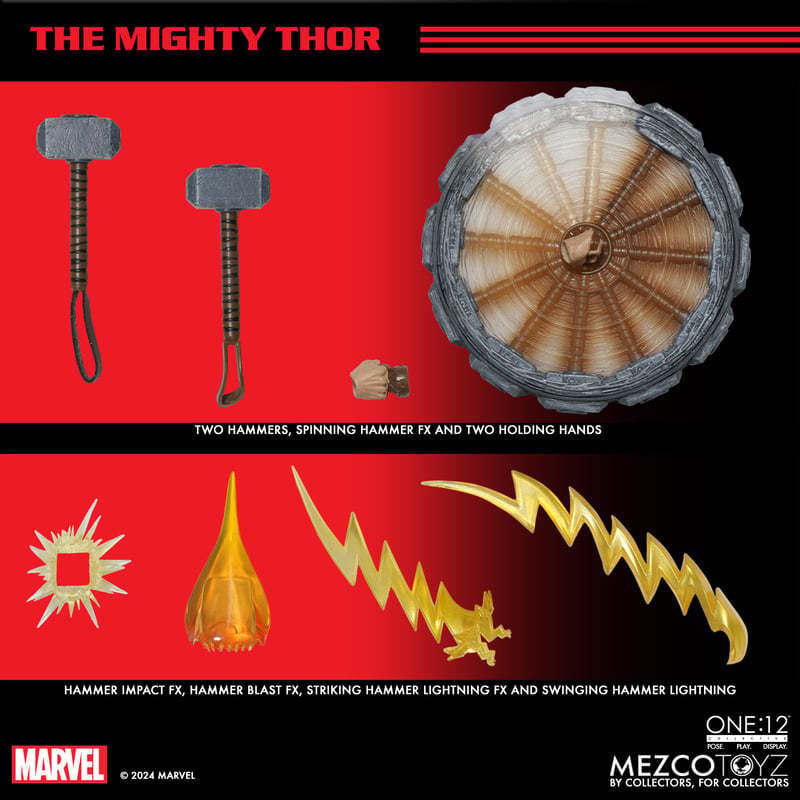 本次的雷神索爾 1/12 比例可動人偶高約 17 公分,以索爾在漫畫中的經典造型打造,雕刻還原他浮誇的手臂肌肉線條,採用皮革及布料的複合材質還原復古的戰衣造型,並在布料披風部分藏有鐵絲,可以依需求調整披風的動態!配件部分收錄兩款替換頭雕、四組替換手型、標誌性的武器雷神之鎚姆約尼爾,並附有揮動的雷神之鎚、雷電擊打擊效果等多款特效件,可以搭配展示重現索爾強大的魄力!