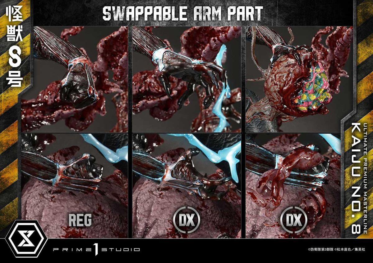 接著看到同步登場的 DX特典版,除了追加怒吼、左眼甲殼破損露出卡夫卡真面目的兩顆替換頭雕與頭雕座之外,更是一口氣附上了多個替換手配件,讓這尊怪獸8號雕像展示起來更具變化性。