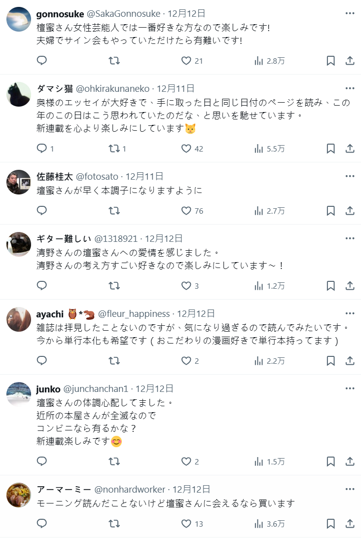 對於清野通以妻子創作,希望代替現在還無法復工的壇蜜讓大家用另一種方式重新認識她,多數網友認為老公這樣做非常溫馨。不少人回應 : 「好期待漫畫中的壇蜜,和電視上的會不會不一樣」、「清野先生對壇蜜的愛情好感人」、「為了能見到壇蜜我一定買」、「不知道漫畫會深入到什麼程度,真的很令人期待!」