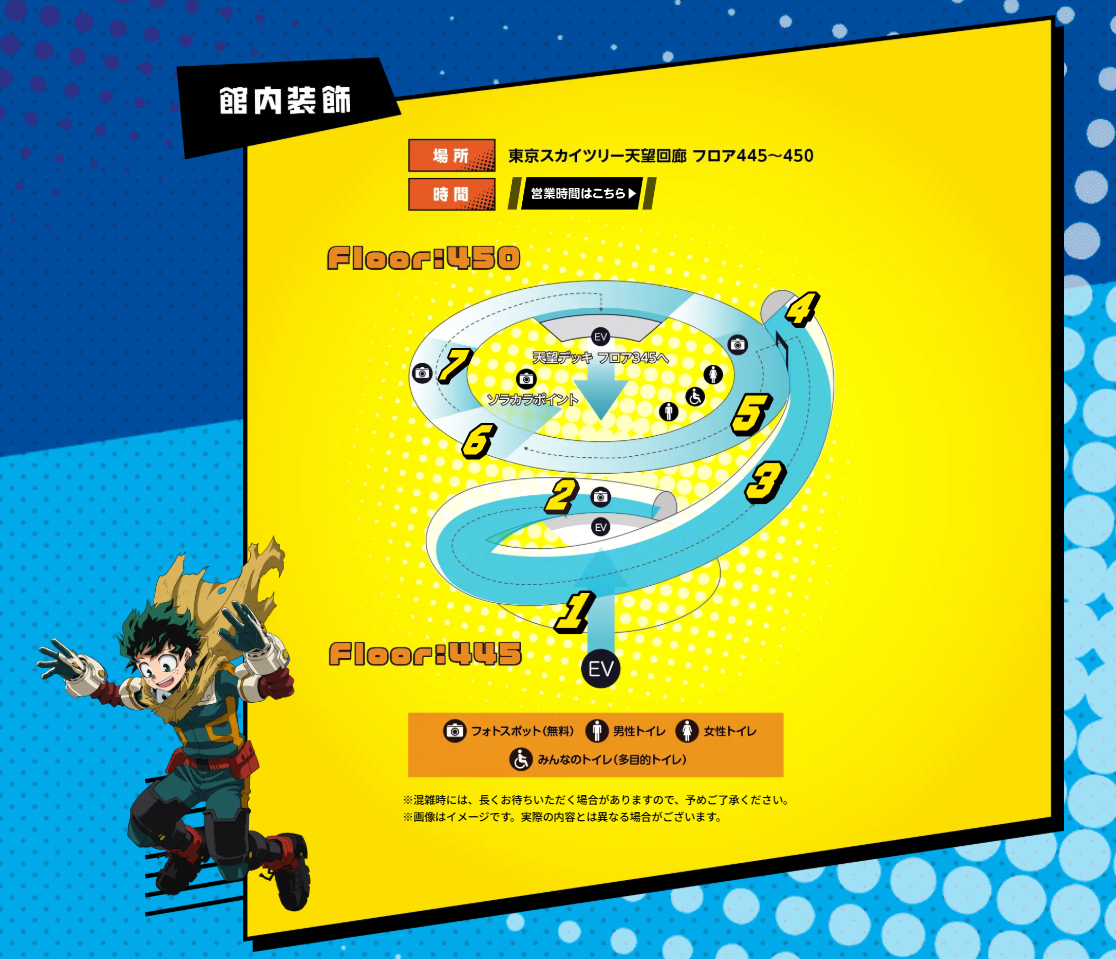 近日宣布與漫畫今年完結,動畫第七季剛結束的《我的英雄學院》合作「スカイツリーでFLOAT! 空の上のヒーロー演習!」 的聯名企劃,在距地面 450 公尺以上的「天望迴廊」舉辦動畫世界觀的展覽,眾多巨型擺設讓粉絲拍照與感受作品的氛圍,該展覽將於 2025 年 1 月 8 日~ 4 月 8 日舉辦。