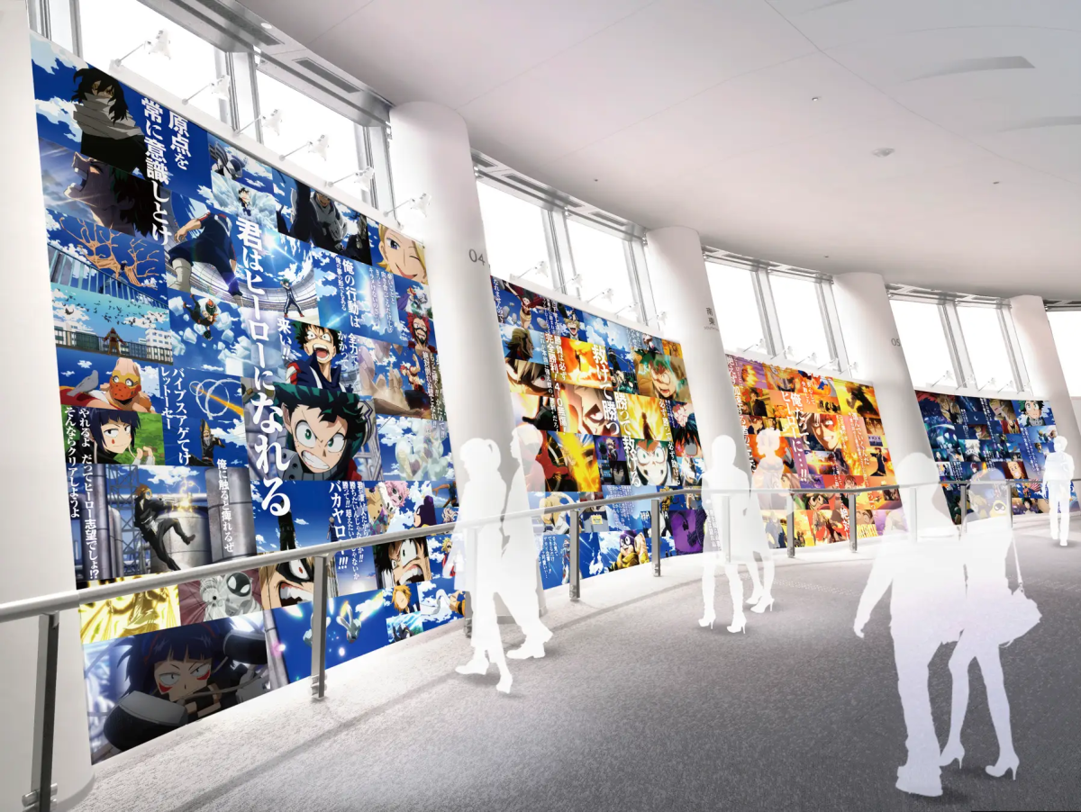 以三人組-綠谷出久、轟焦凍、與爆豪勝己的組合,繪製插圖製作成背板放置在超過 400 公尺的高空的迴廊末端讓粉絲拍照。