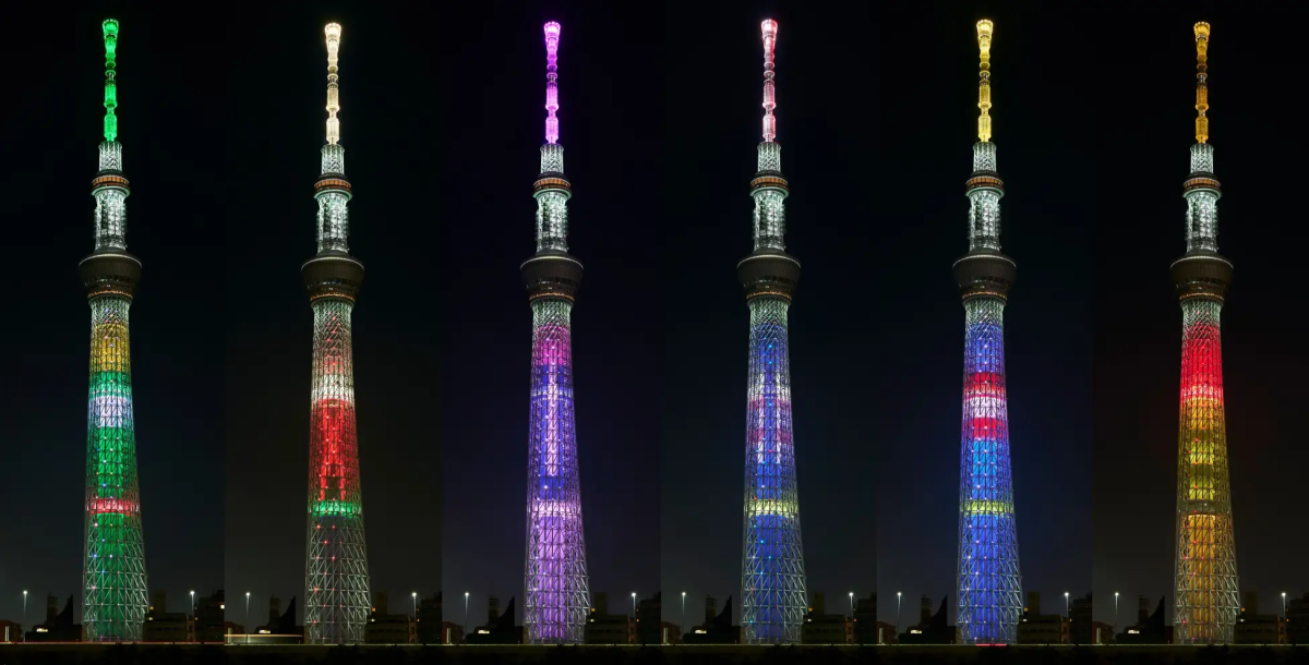 展覽期間,東京晴空塔也會依照六種人物主題切換外部燈光顏色。