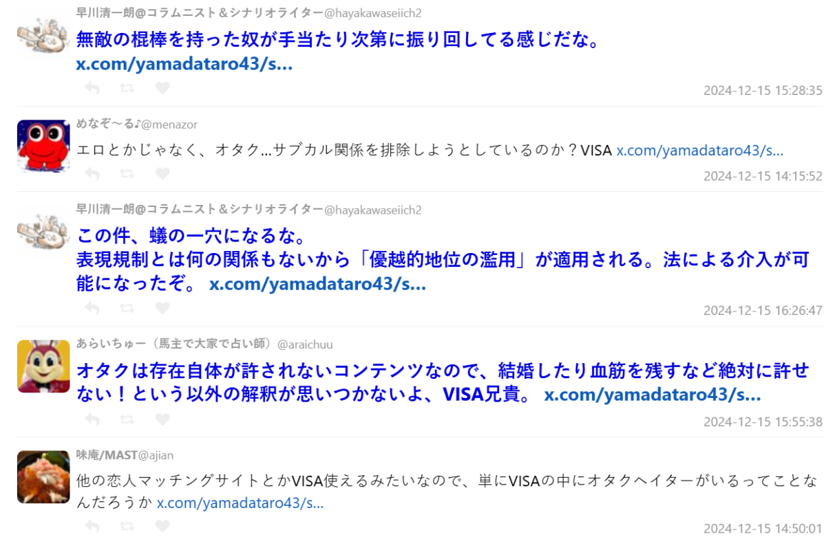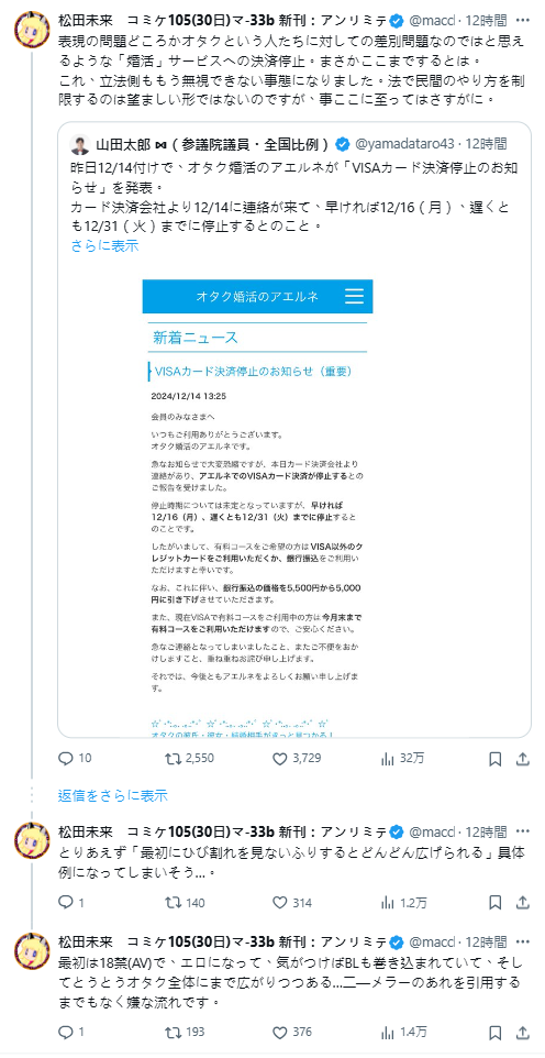 其後,漫畫家松田未來也對此發表質疑,對於所謂「婚活」服務的支付停止,這不僅是表達方式的問題,甚至可以說是對御宅族這類人的歧視問題。沒想到事情竟然發展到這個地步。這恐怕會成為一個「一開始裝作沒看到裂縫,結果裂縫越來越大」的具體案例了