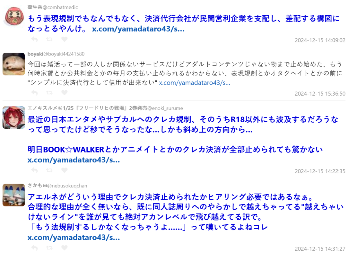 一開始是針對 18 禁(成人影片)的限制,接著擴展到情色內容,然後連 BL 都被捲進來,現在甚至開始波及整個御宅族群體了…這樣的發展真的讓人感到很不妙。