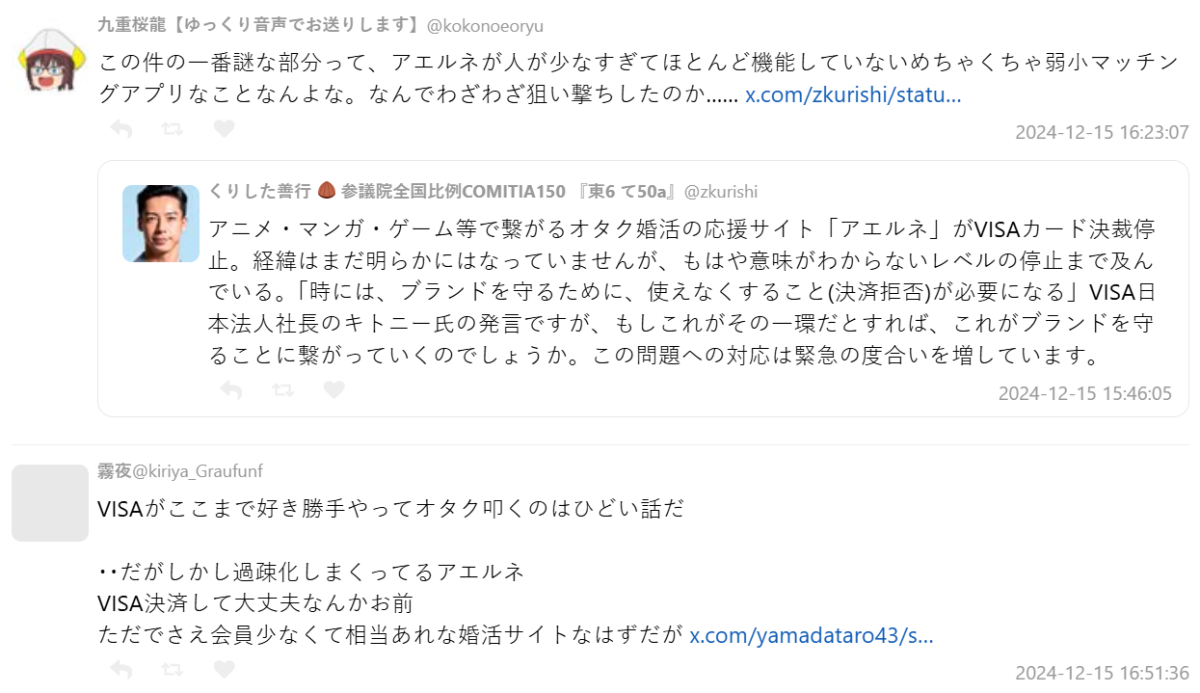 沒想到近日,連專為御宅族量身打造的婚活平台「aellune」( アエルネ ) 也接到信用卡結算公司的通知,VISA 卡支付功能即將停止服務。這也引起網民關注,沒想到連這種平台也會受到波及。